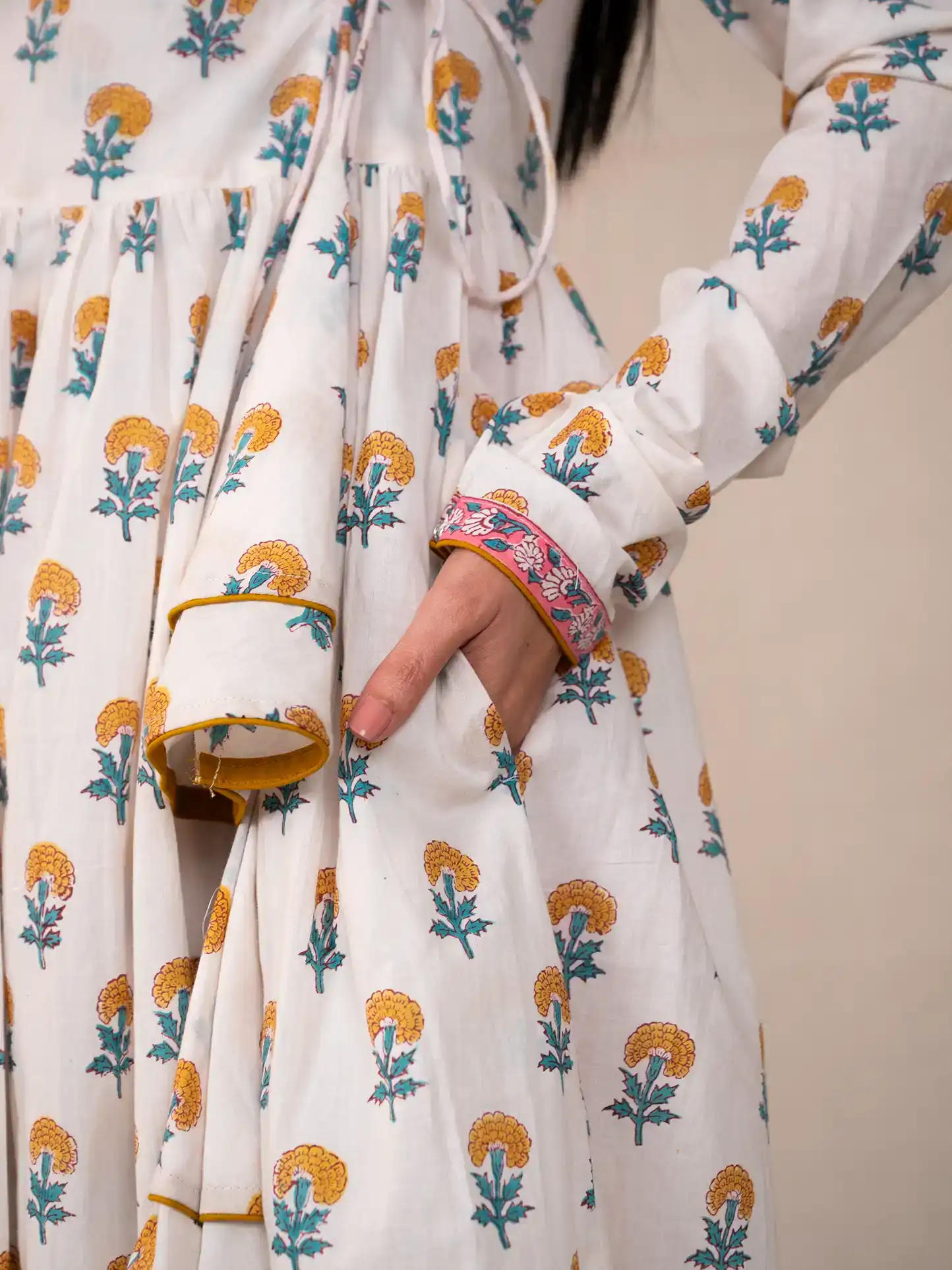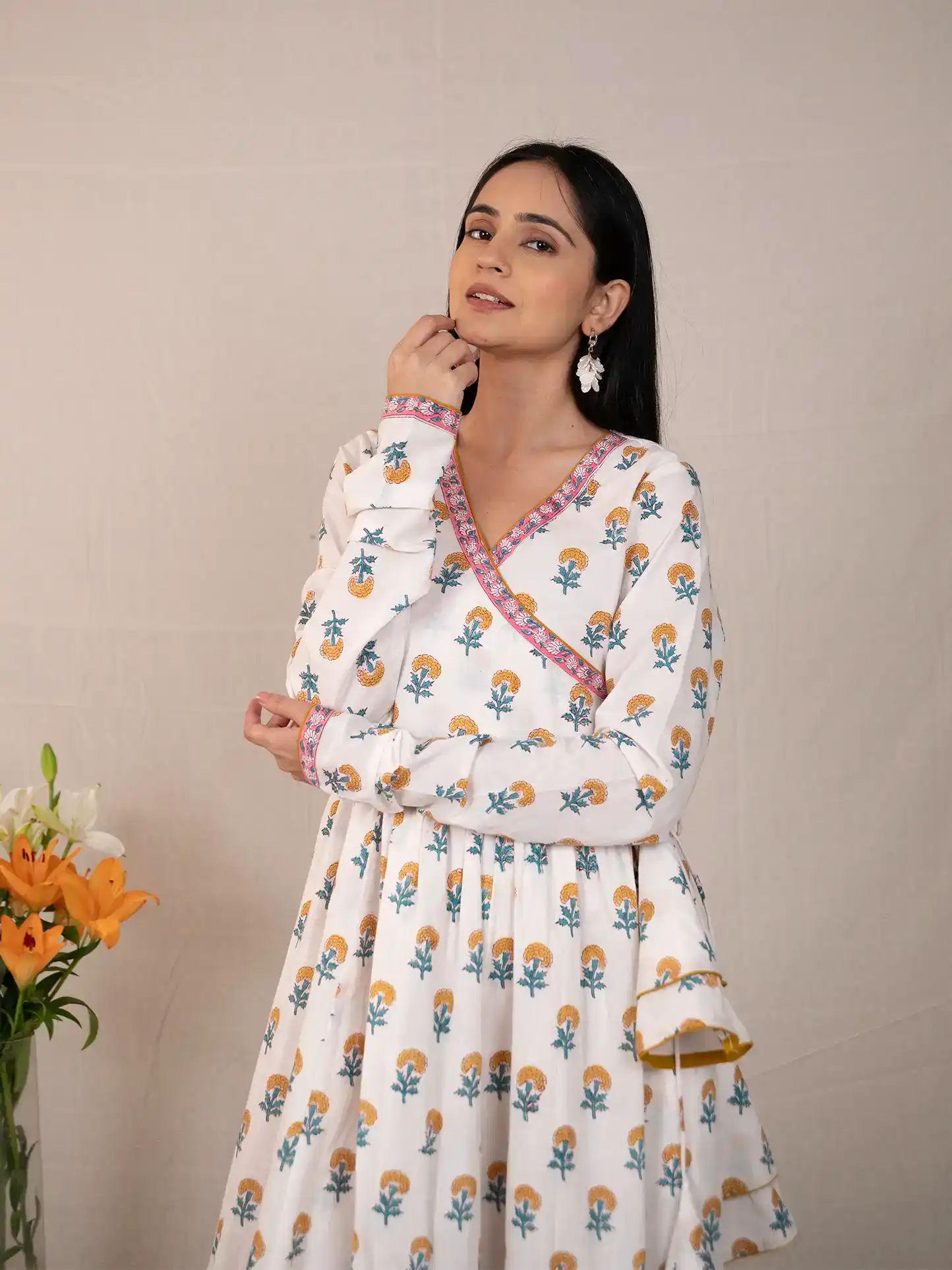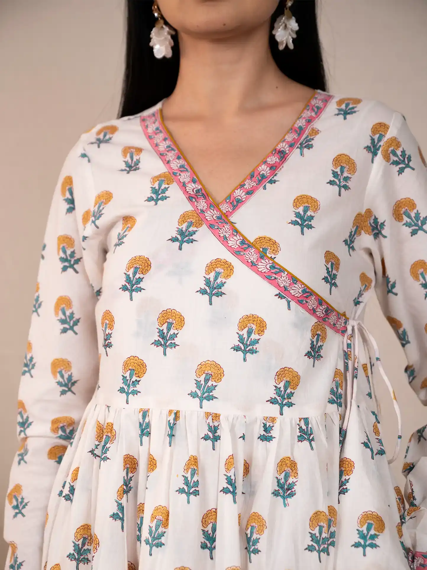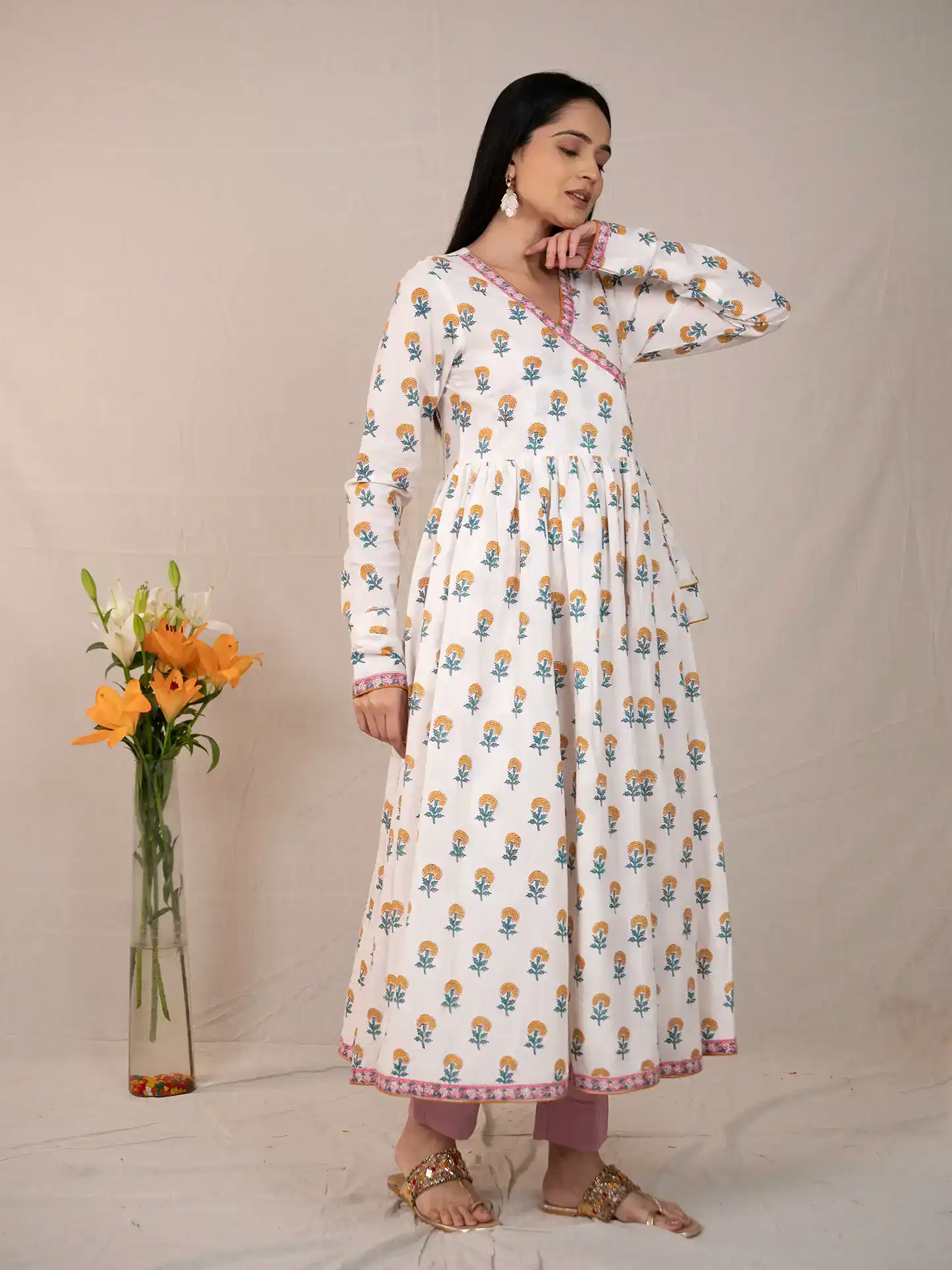 Product Descripiton :Bright, joyful, and steeped in tradition — this Yellow & Pink Angrakha Kurta Set brings sunshine to your wardrobe. Crafted from 100% pure cotton, the kurta features a wrap-style angrakha silhouette, hand block printed with charming floral motifs in vibrant pink and yellow