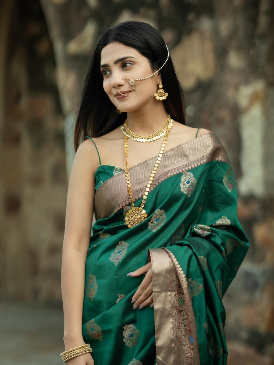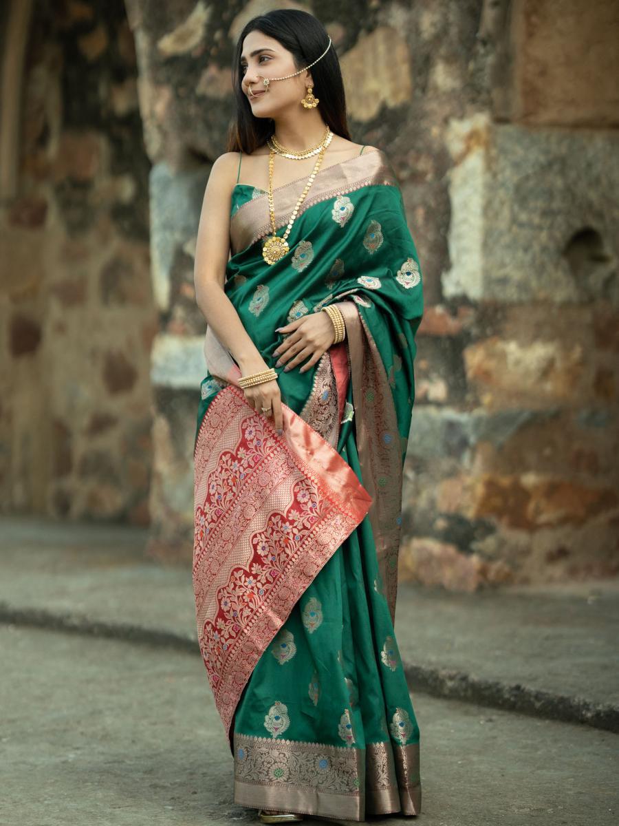 Product Descripiton :Step into a world of regal allure with this Bahaar Uppada Silk Saree. A striking blend of two classic hues, the deep green base is beautifully complemented by the vibrant red pallu and intricate detailing. Crafted from luxurious Katan silk, this saree is a true masterpiece of Banarasi artistry, perfect for weddings, festive gatherings, or cultural celebrations