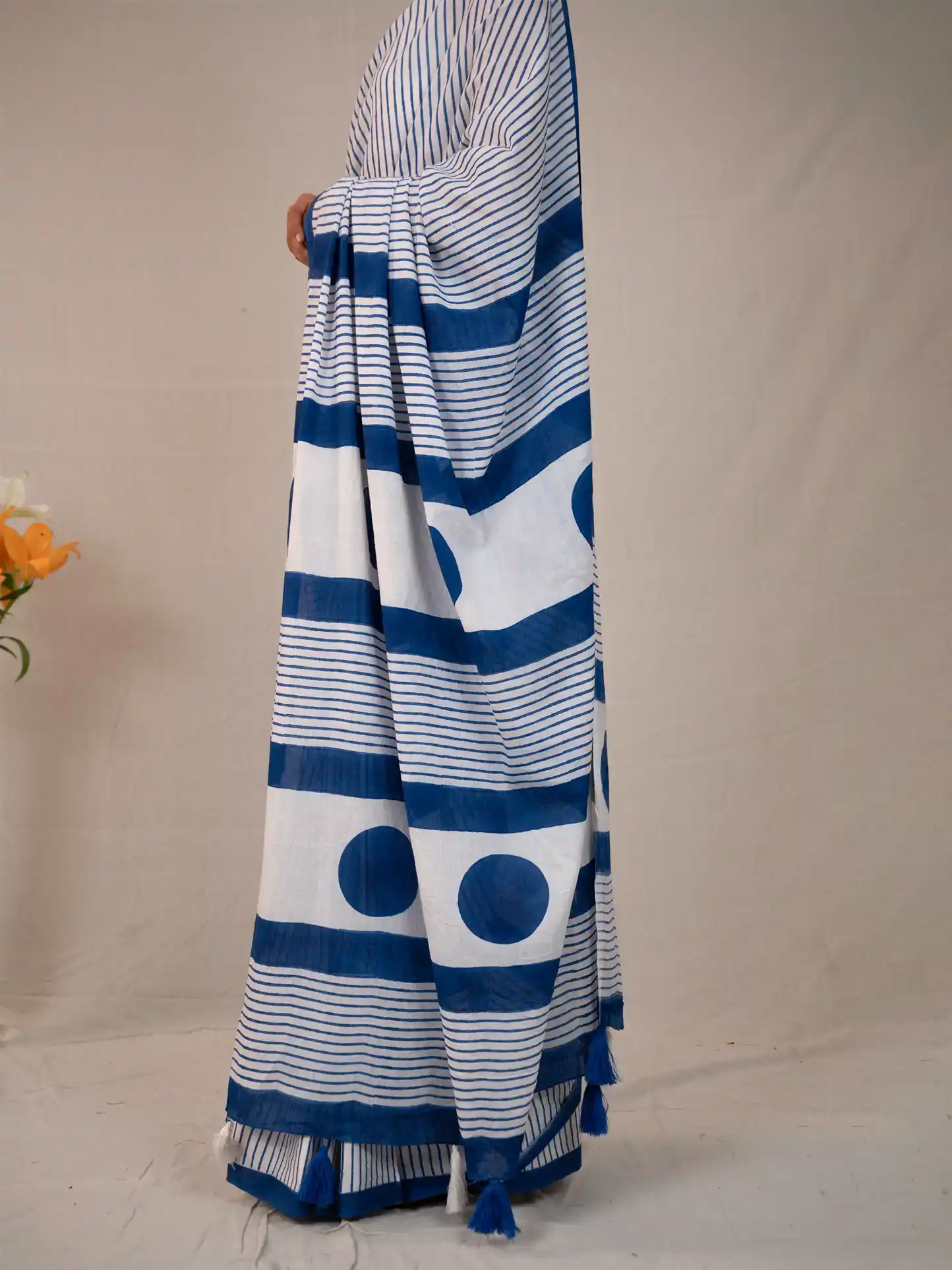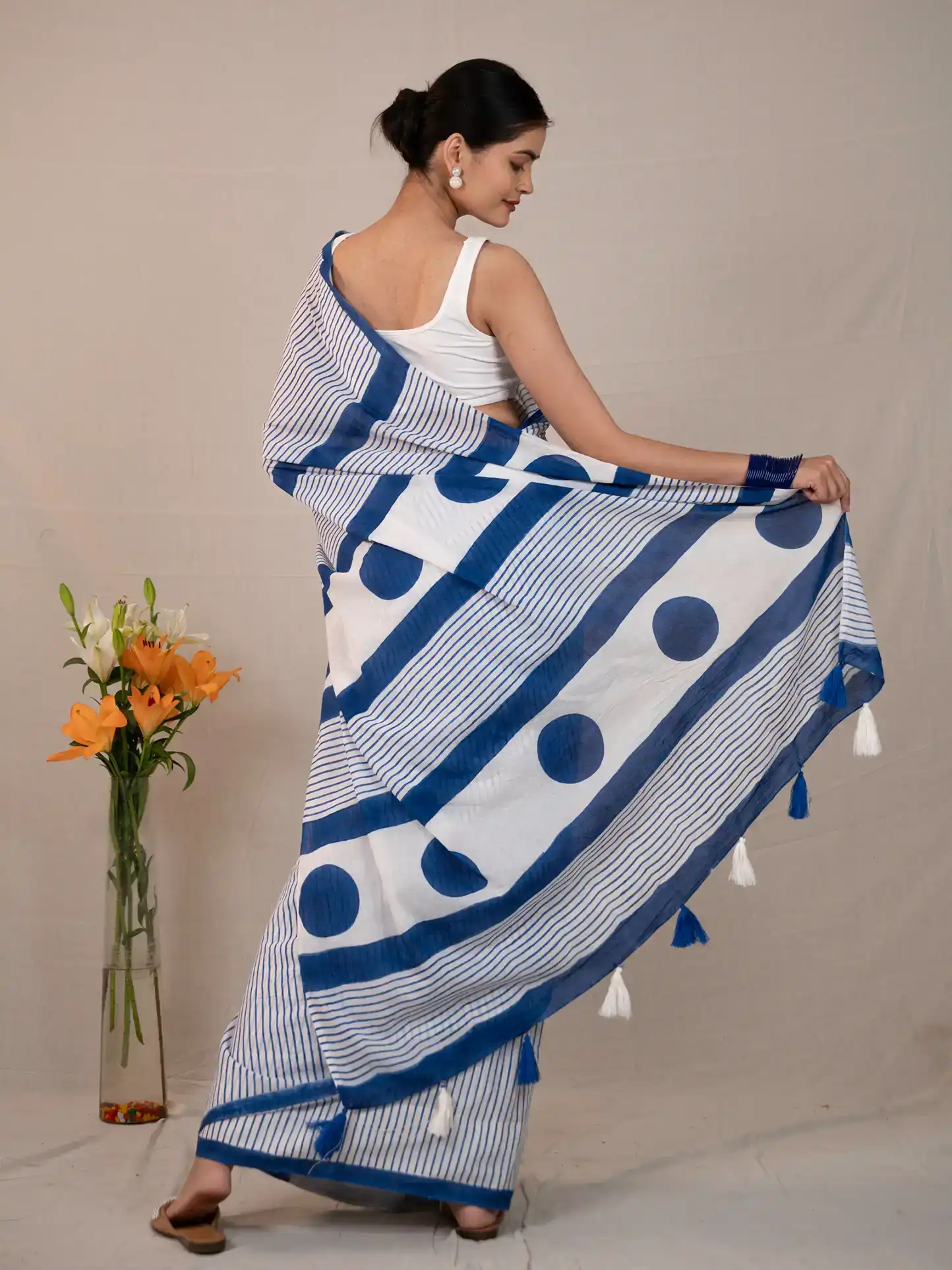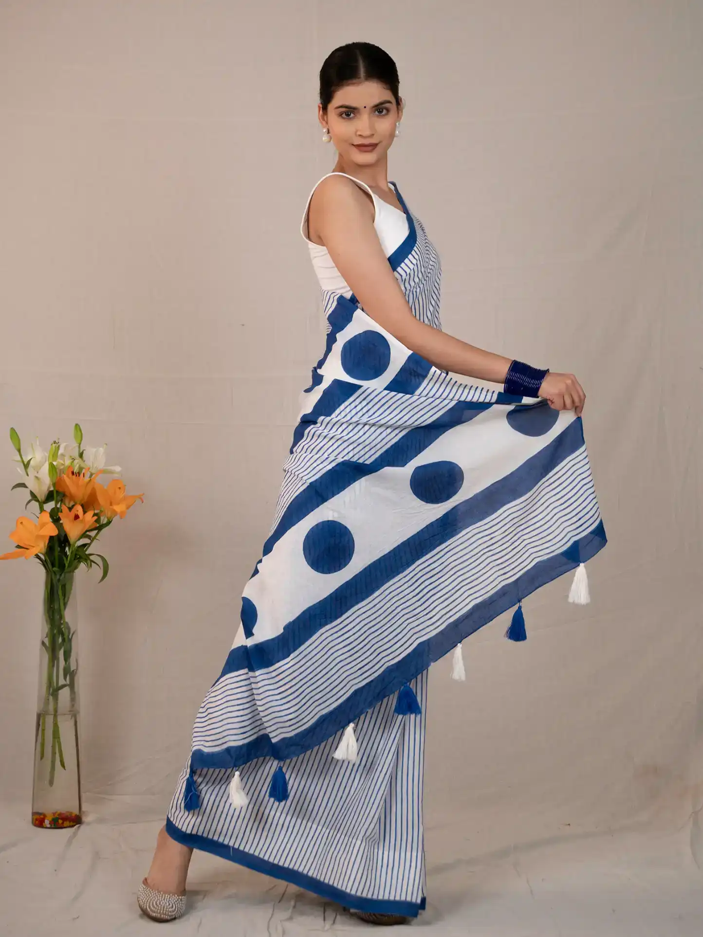 Product Descripiton :Playful yet poised, this Blue Polka Dot Saree is hand block printed in soft 100% cotton, offering comfort with character. The classic polka dot motif is reimagined through handcraft - giving each dot its own personality and charm