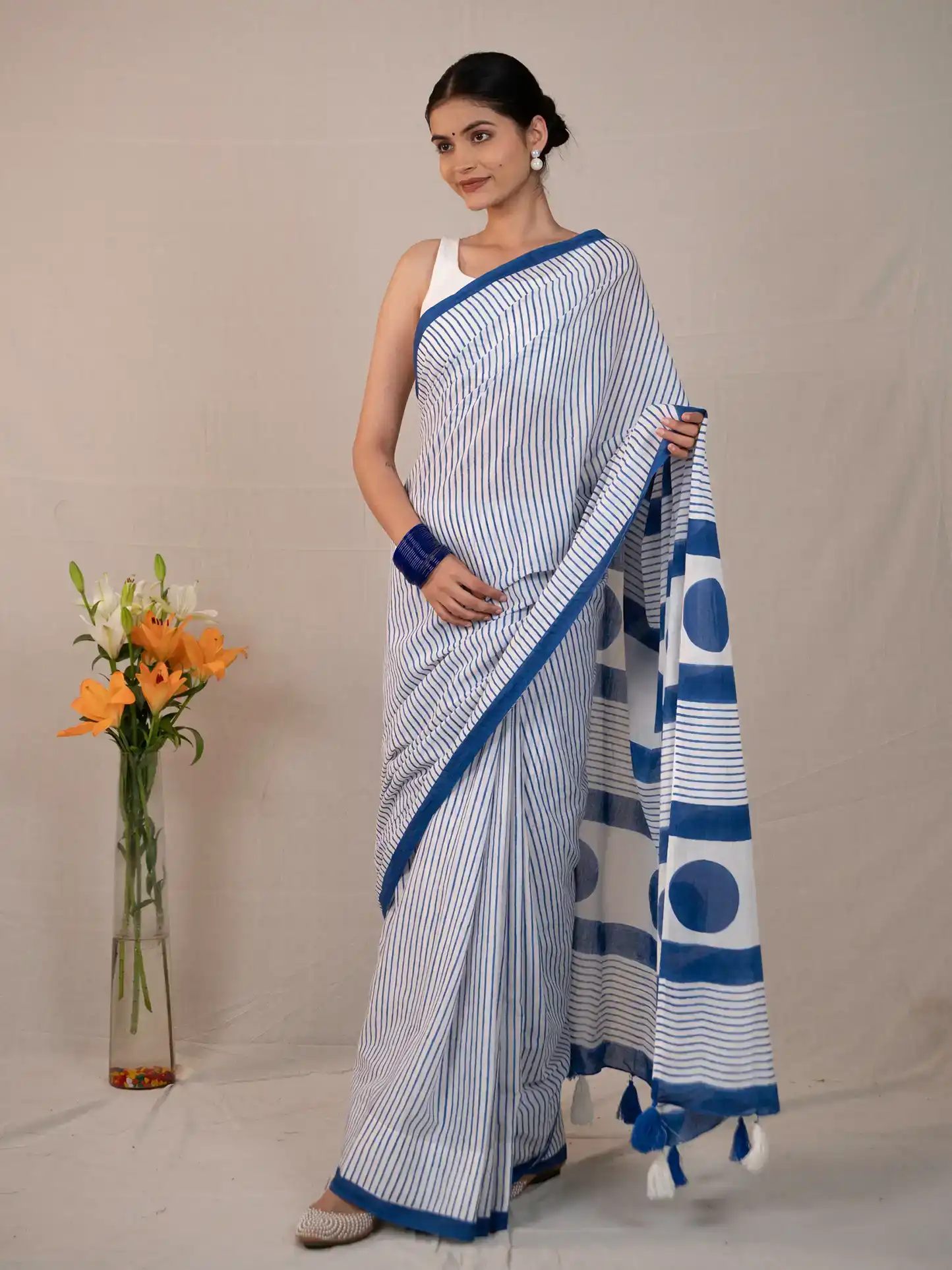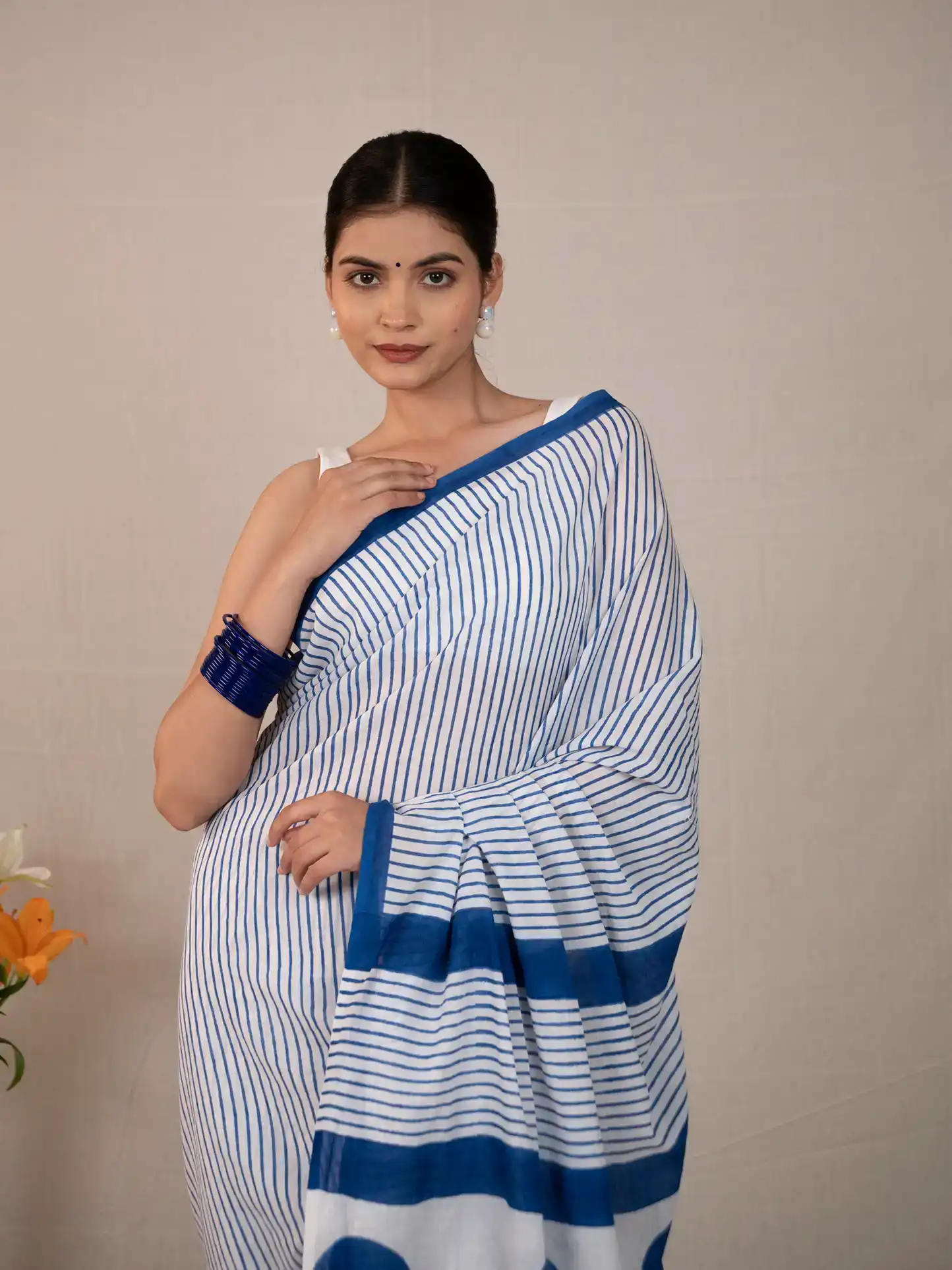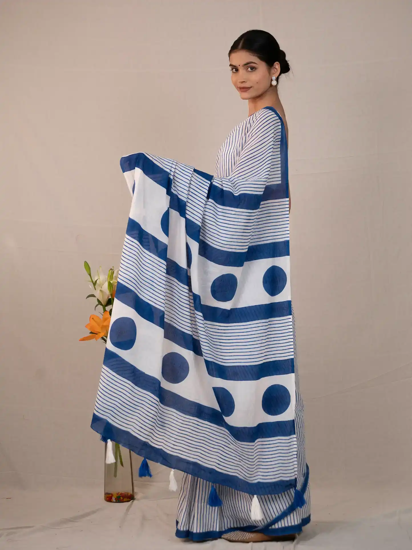 Product Descripiton :Playful yet poised, this Blue Polka Dot Saree is hand block printed in soft 100% cotton, offering comfort with character. The classic polka dot motif is reimagined through handcraft - giving each dot its own personality and charm