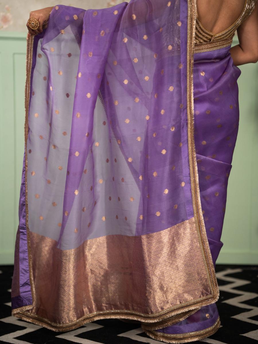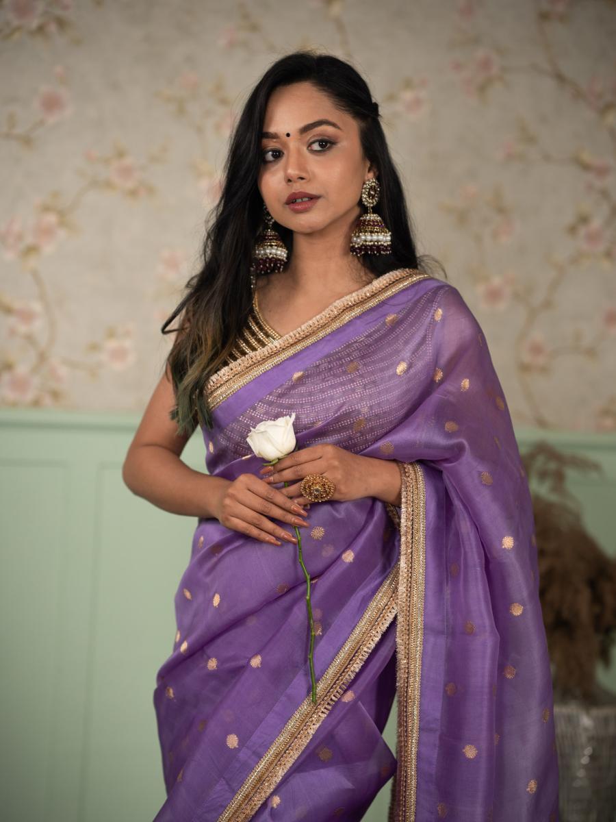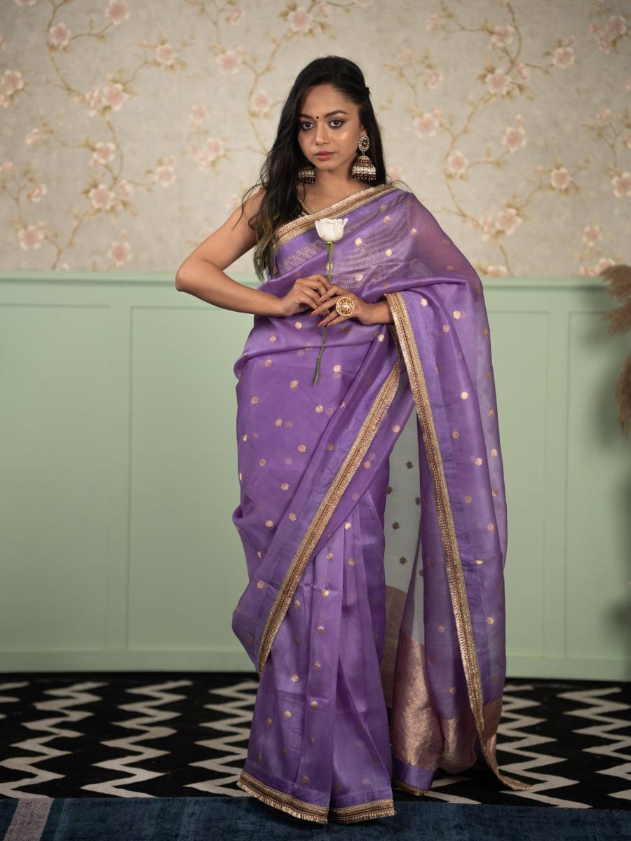 Product Descripiton :Elevate your style with this Chandni Pure Organza Silk Saree, a delicate blend of luxury and tradition. The lightweight organza fabric offers a soft, airy drape, while the intricate Zari booti work adds a touch of timeless Banarasi craftsmanship. The serene lavender hue enhances its ethereal beauty, making it perfect for weddings, festive occasions, or sophisticated evening events