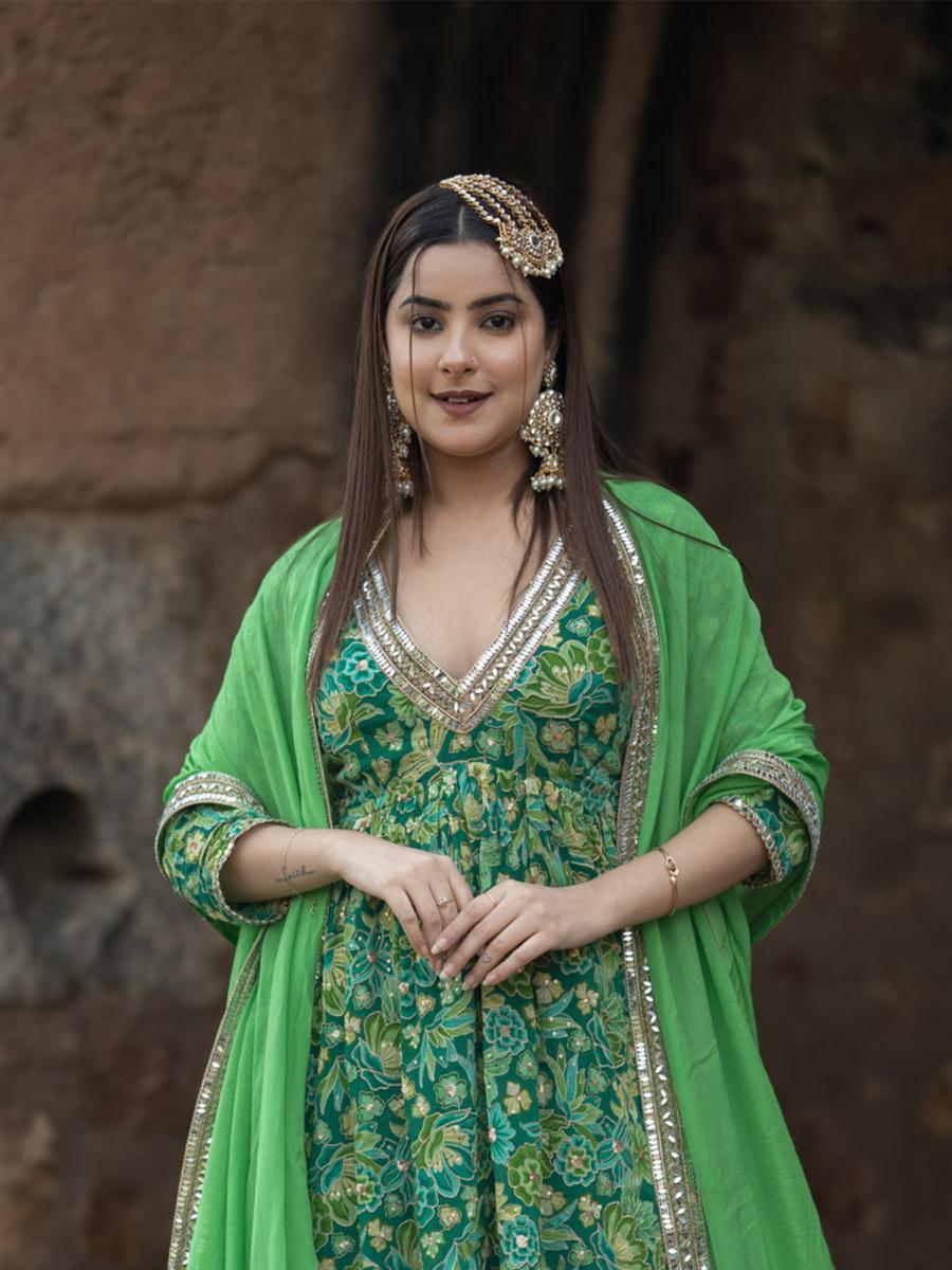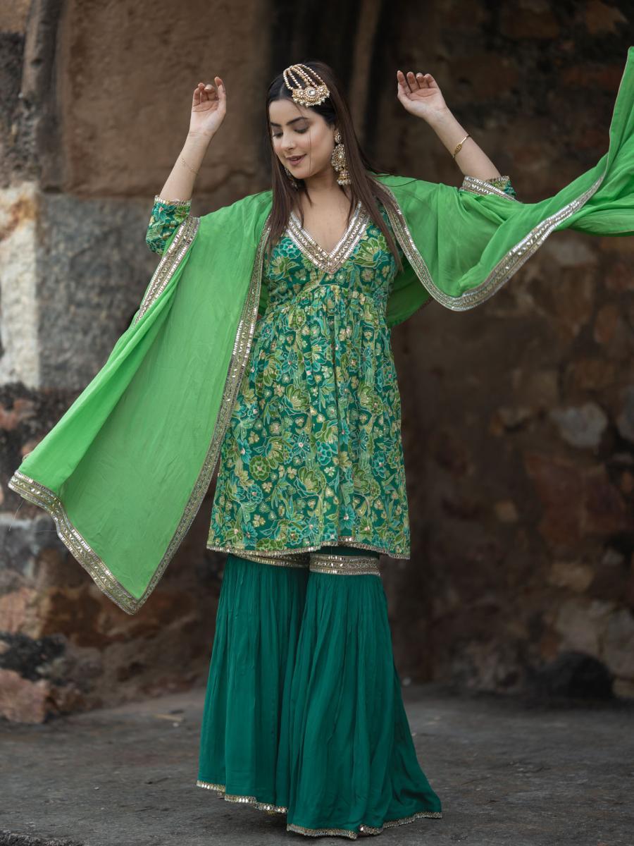 Product Descripiton :Make a captivating statement with this Green Chinnon Chiffon Garara Set, a perfect blend of tradition and modern sophistication. The set features a flowy kurta paired with a stunning garara, both enhanced with delicate mirror work lace detailing that adds an element of shimmer. Accompanied by a matching dupatta adorned with similar mirror work lace, this ensemble is a must-have for weddings, festive celebrations, and special occasions