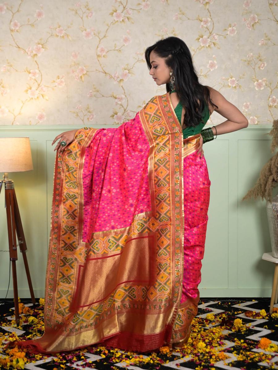 Product Descripiton :Step into the world of classic luxury with this stunning Gulaabi Katan Silk Saree, a true representation of traditional Banarasi craftsmanship. Featuring a rich pink base contrasted with a vibrant green pallu, this saree exudes elegance and sophistication. The soft and luxurious Katan silk fabric ensures a graceful drape, making it perfect for weddings, festive occasions, or cultural celebrations.