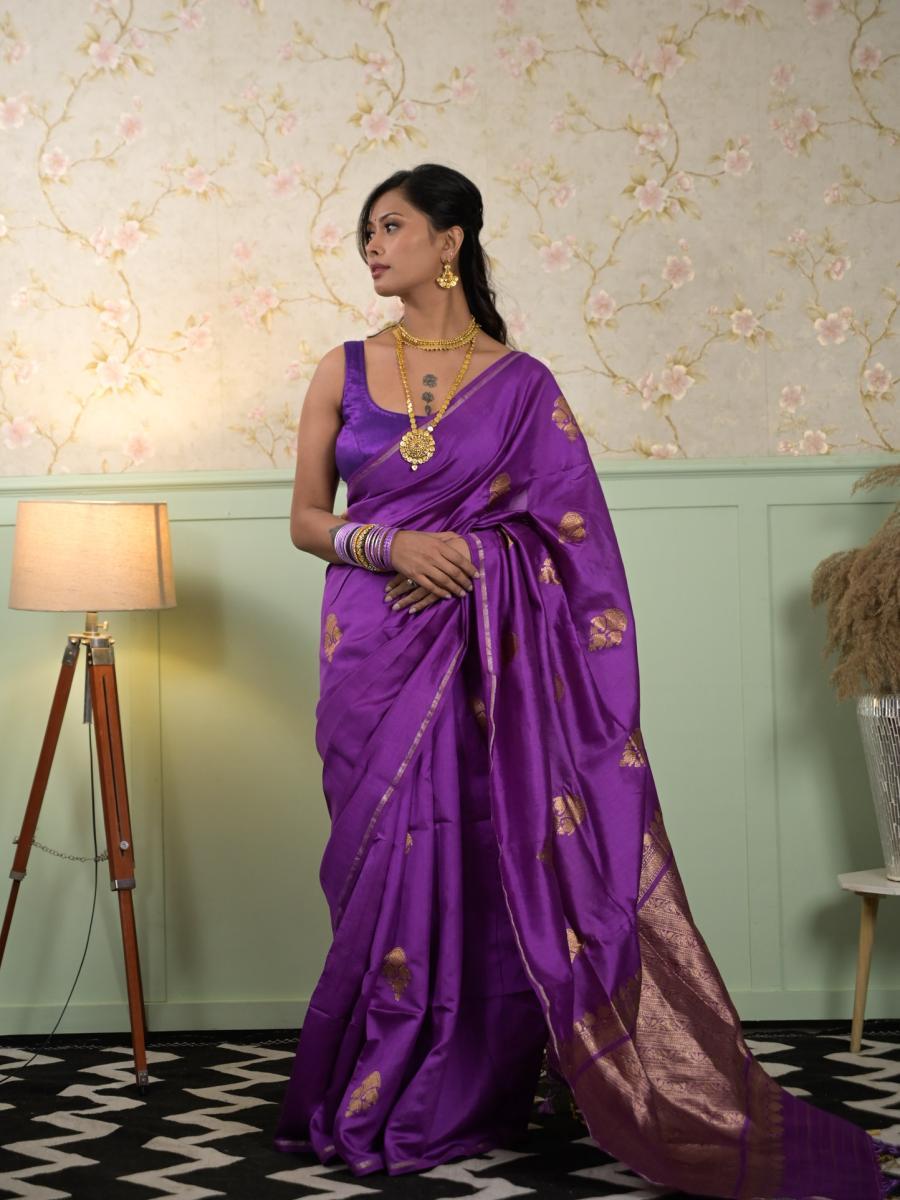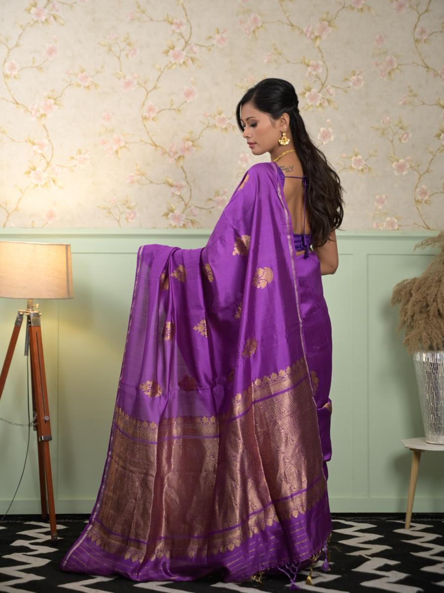 Product Descripiton :Make a bold and elegant statement with this Jaamuni Pure Munga Silk Saree, an exquisite representation of heritage weaving. Handcrafted with the intricate Kadhua technique, this saree exudes sophistication and timeless charm. The rich purple hue enhances its regal appeal, while the lightweight Munga silk fabric ensures comfort and a flawless drape