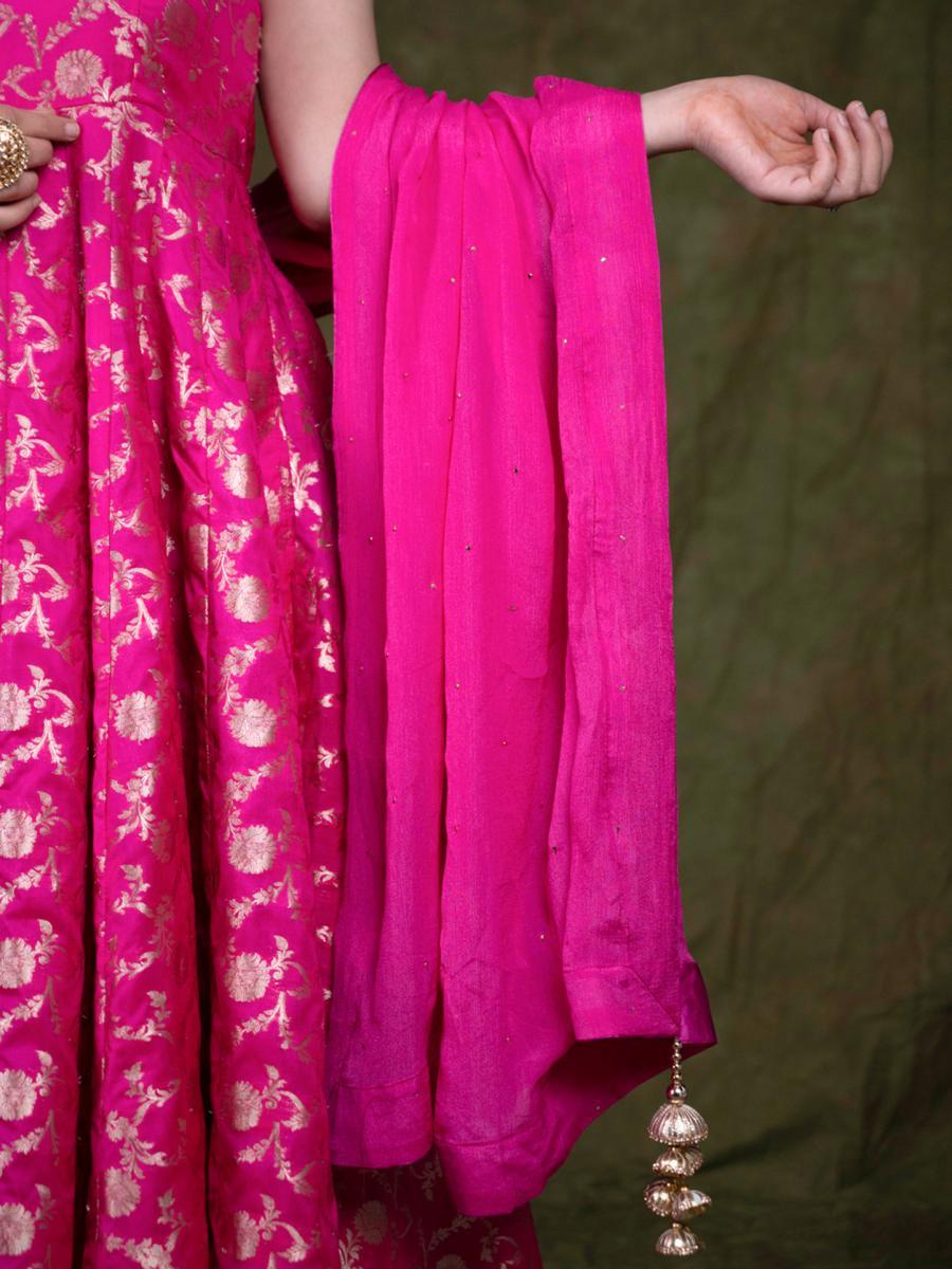 Product Descripiton :Step into elegance with this Khwaab Anarkali Set with Dupatta, a graceful creation featuring intricate craftsmanship. The luxurious Banarasi silk fabric adds a rich texture, while the matching dupatta completes the regal look. Perfect for weddings, festive occasions, or cultural celebrations, this ensemble exudes sophistication and charm
