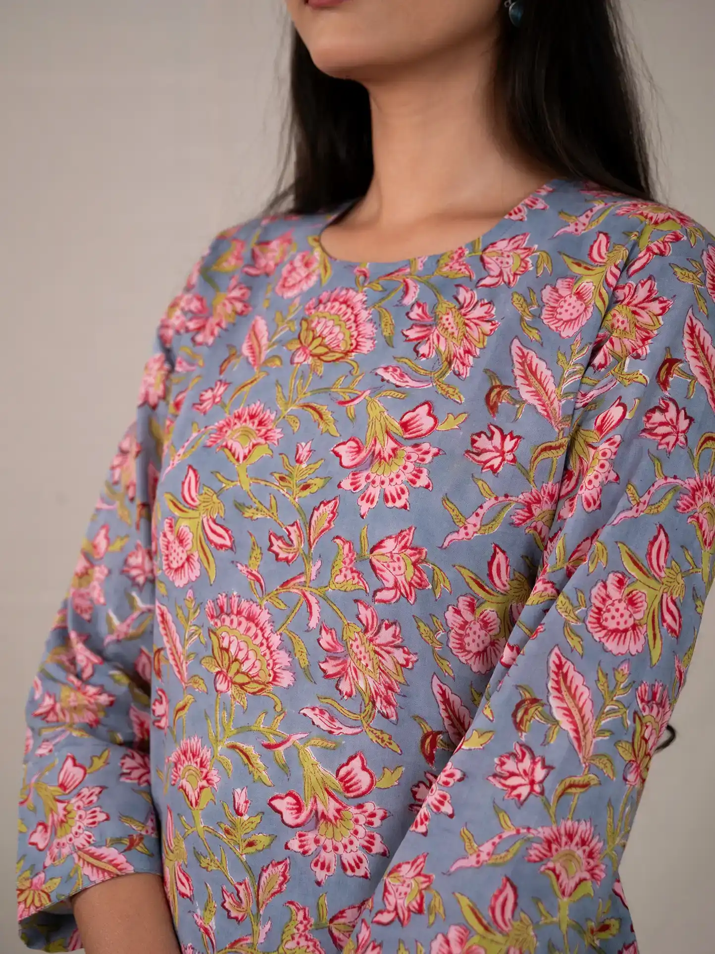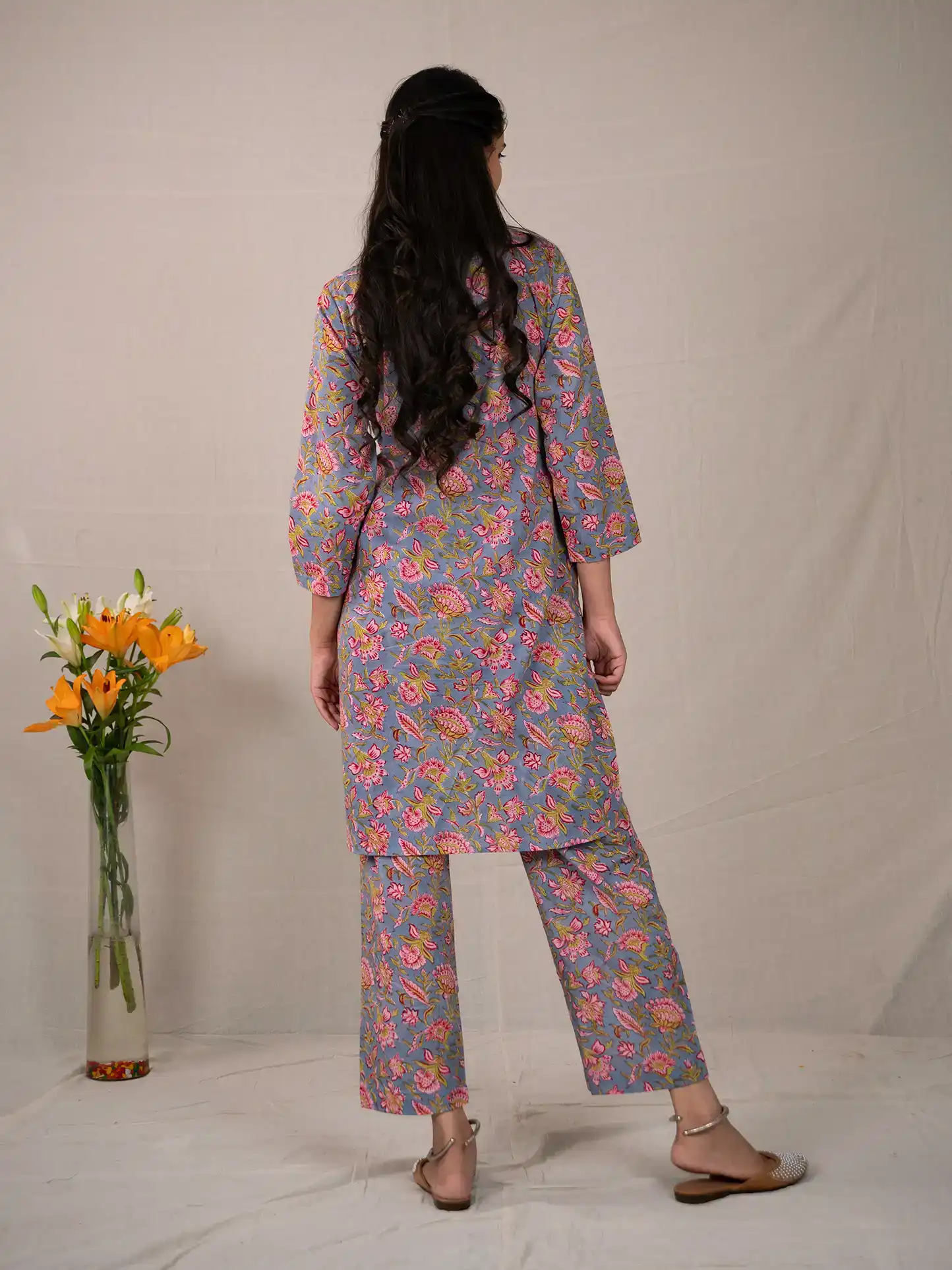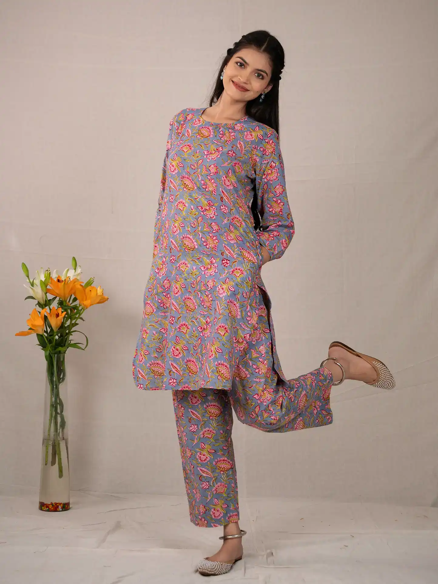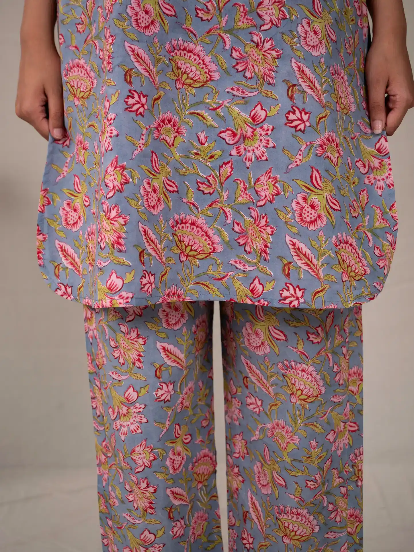 Product Descripiton :Designed for everyday elegance, this Light Grey and Red Coord Set is made from 100% soft cotton, hand block printed with fine micro motifs that add subtle charm to your daily wardrobe