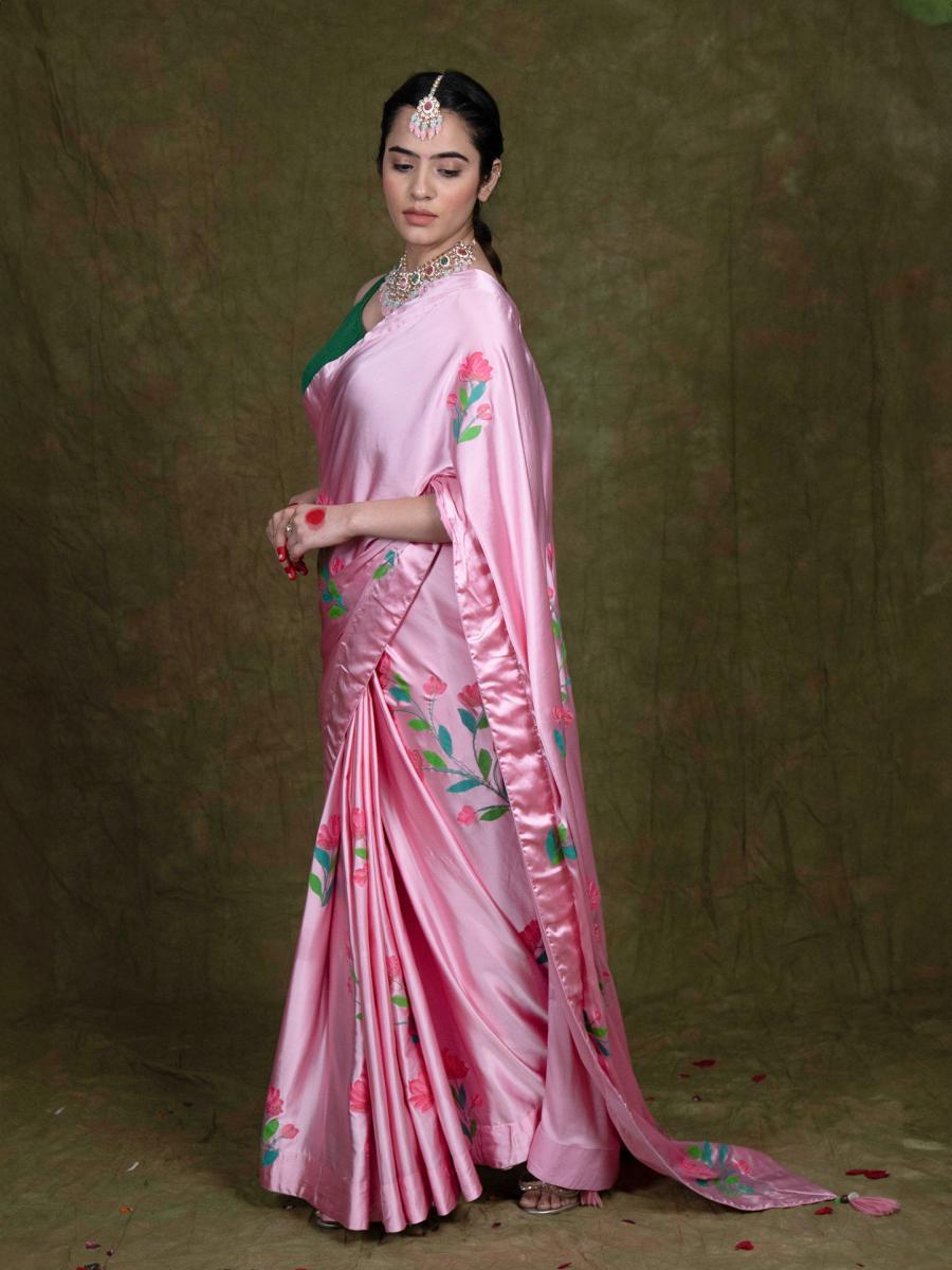 Product Descripiton :Drape yourself in the timeless beauty of this Meher Handpainted Saree, a perfect blend of luxurious fabric and exquisite craftsmanship. Featuring delicate, hand-painted designs, this saree showcases the mastery of skilled artisans, bringing heritage artistry to life. Crafted from soft, flowy modal silk, this saree is ideal for festive celebrations, weddings, or elegant evenings, making you shine with effortless charm