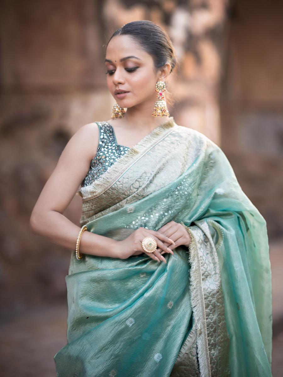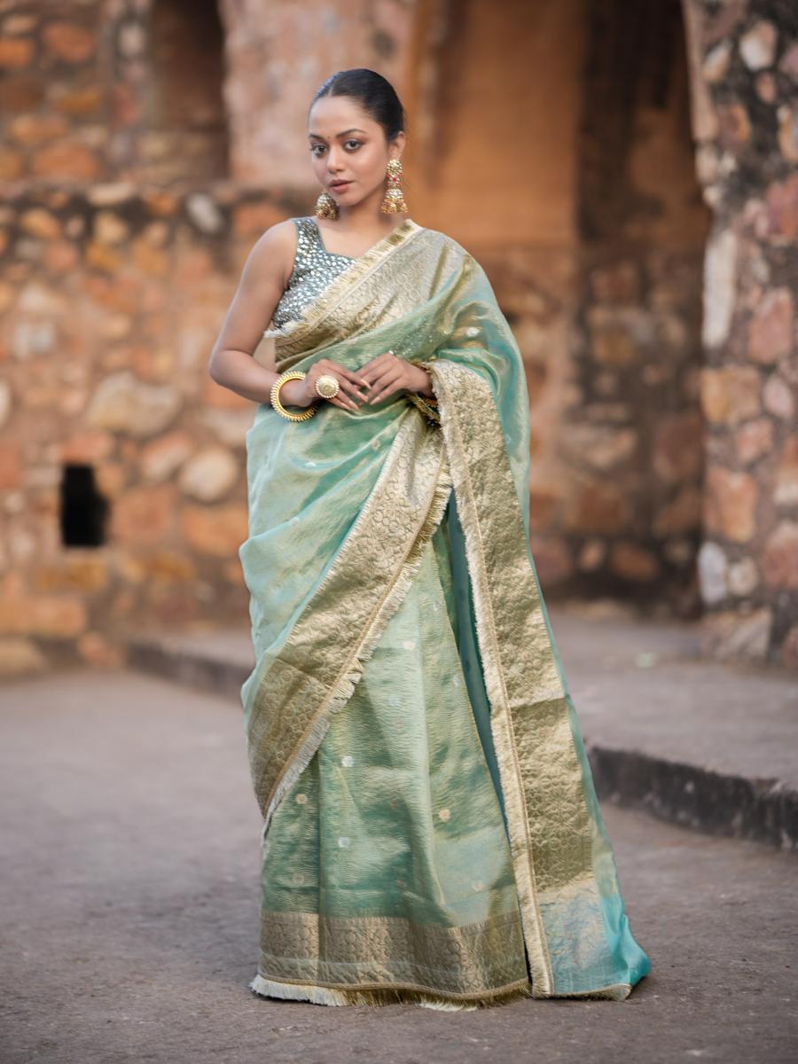 Product Descripiton :Unveil the beauty of understated luxury with this mint green Crushed Tissue Silk Saree. Exquisitely woven on traditional Banarasi looms, this saree features a delicate crushed texture that enhances its ethereal elegance. The mint green hue combined with the subtle sheen of tissue silk creates a breathtakingly graceful ensemble, perfect for weddings, evening events, or festive celebrations