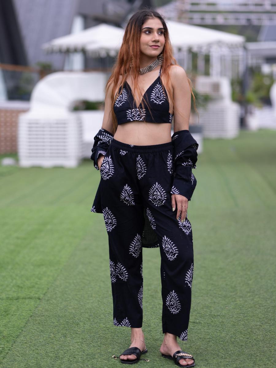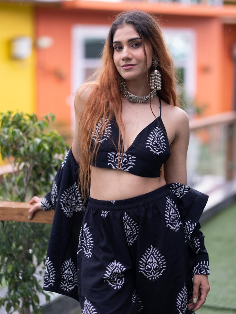Product Descripiton :Make a stunning statement with this Mughal Hand Block Printed Co-ord Set, a perfect fusion of traditional artistry and modern fashion. This unique set features intricate Mughal-inspired hand block prints on soft, breathable fabric, combining elegance and comfort. The set includes a bikini top, bikini bottom, and a coordinating shrug, making it versatile for beach vacations, poolside lounging, or casual summer outings