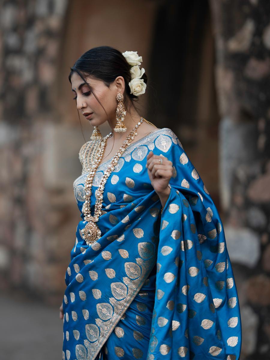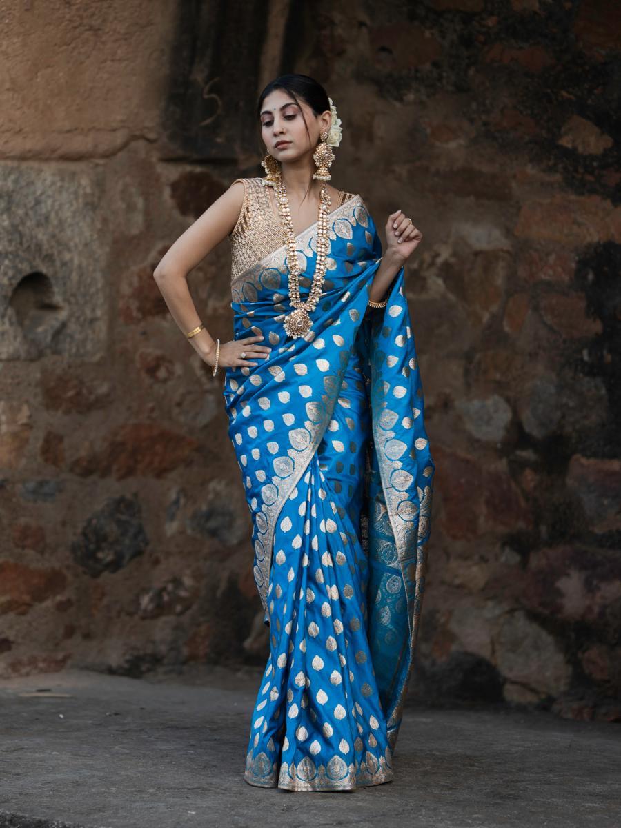 Product Descripiton :Step into the world of timeless beauty with this Neelam Handloom Banarasi Katan Silk Saree. The vibrant blue, accentuated by intricately woven gold zari butis, embodies luxury and elegance. Handcrafted by skilled artisans, this saree is a perfect reflection of traditional Indian craftsmanship. Whether it’s a wedding, festive occasion, or cultural celebration, this saree promises to make you the epitome of elegance and grace
