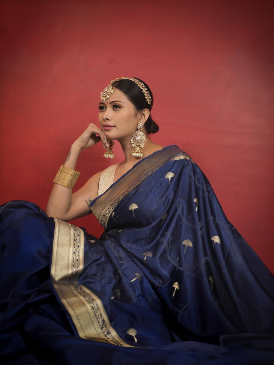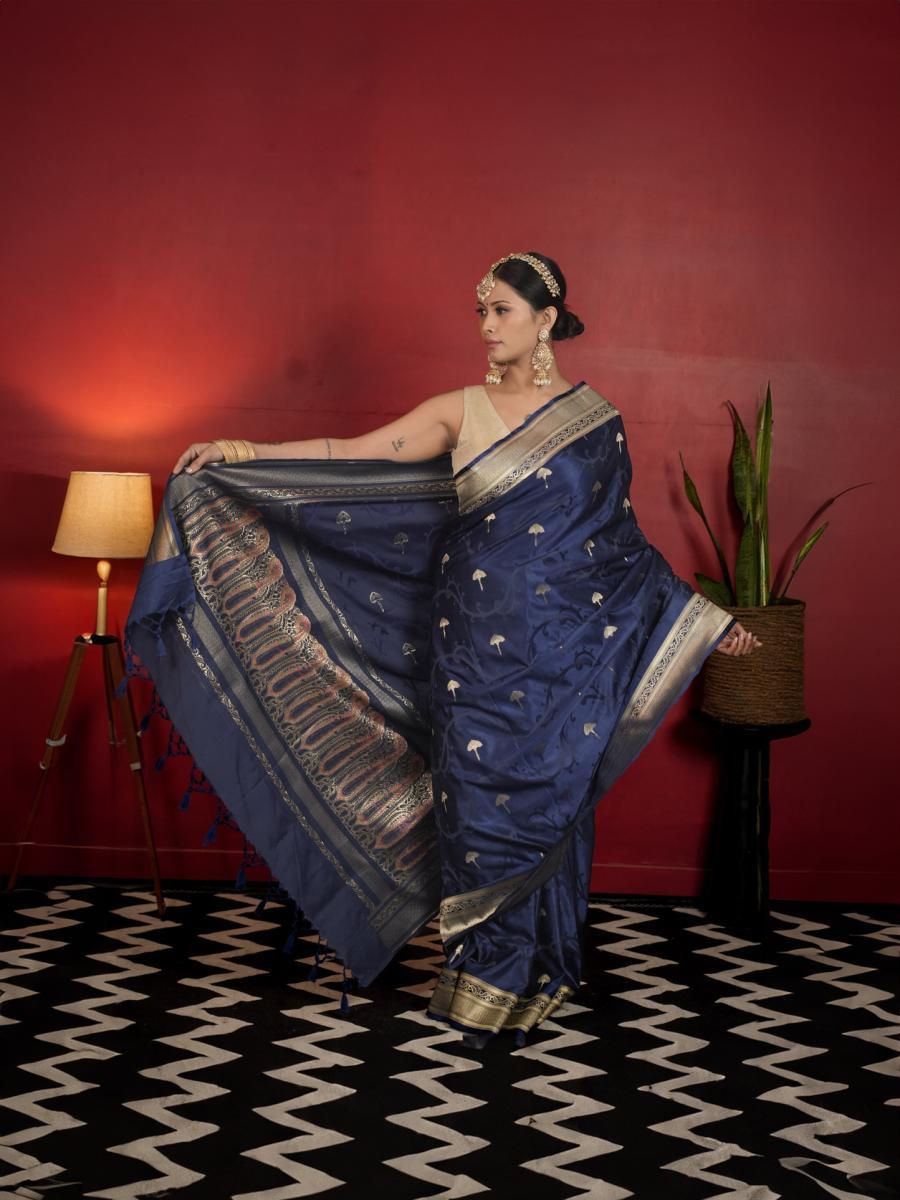 Product Descripiton :Step into timeless sophistication with this Neelima Butter Silk Saree, exquisitely adorned with intricate gold zari booti work. The luxurious butter silk fabric offers a smooth texture and a lightweight drape, ensuring both comfort and elegance. The regal royal blue hue, complemented by the shimmering gold detailing, makes this saree perfect for weddings, festive occasions, or grand celebrations