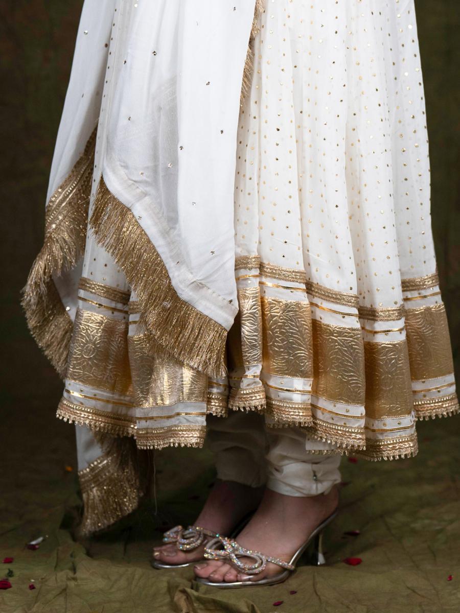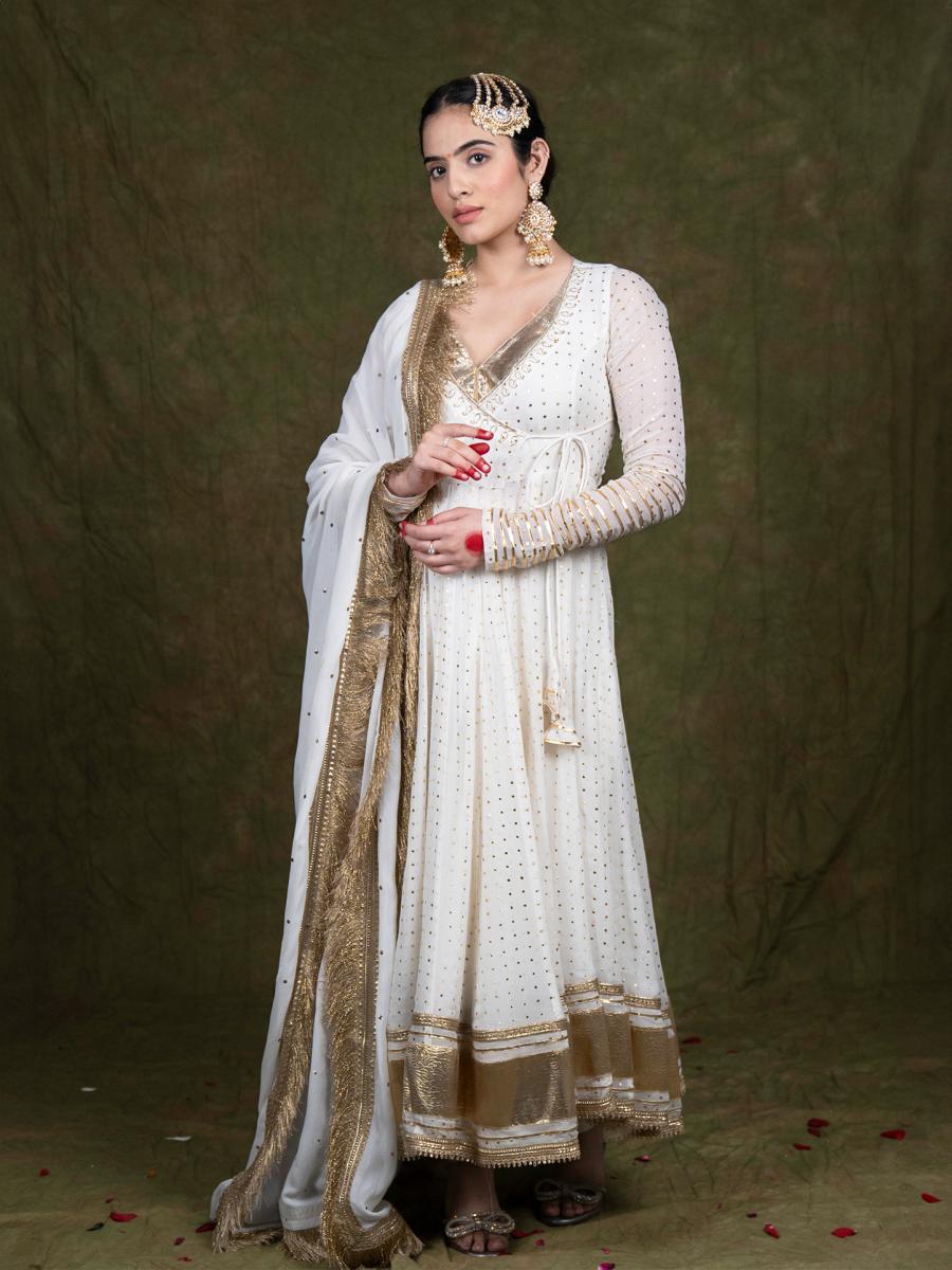Product Descripiton :Step into sophistication with this Noor Angrakha Churidar Set, featuring intricate hand embroidery on the neckline, elegant gotta detailing on the sleeves and flare, and a beautiful Mukesh work dupatta with lace accents. Adding versatility to your festive wardrobe, this ensemble includes a separate gota blouse to style with the dupatta for a completely different look. Perfect for weddings, celebrations, or cultural events, this outfit blends heritage craftsmanship with modern versatility
