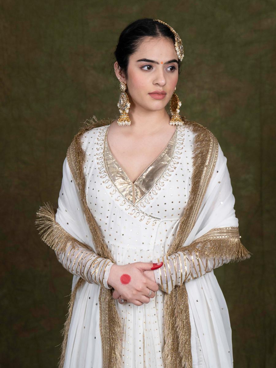 Styling Inspiration:Style the Angrakha kurta and churidar with statement kundan or pearl jewelry for a timeless look Add a metallic clutch or potli bag to enhance the ensemble’s charm