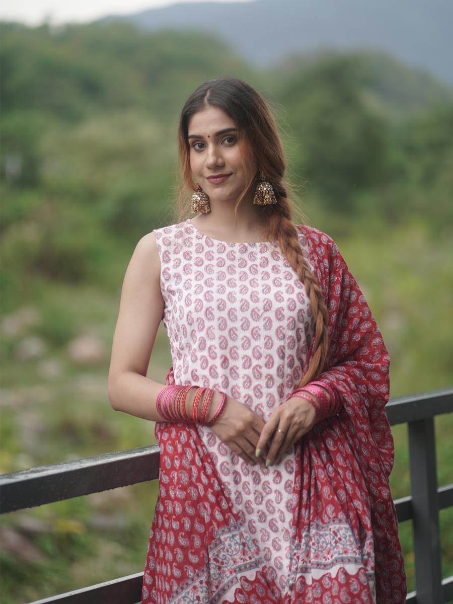 Product Descripiton :Turn heads with this noor handblock printed kurta set for women, a striking combination of traditional craftsmanship and contemporary design. Featuring intricate hand block prints, this sleeveless kurta is crafted from soft, breathable fabric for unmatched comfort. Paired with coordinating bottoms, this set is perfect for festive occasions, casual outings, or cultural events