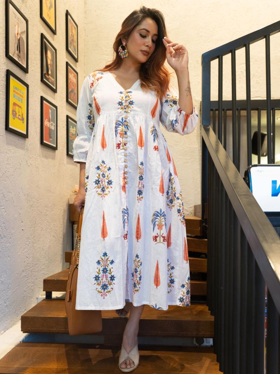 Product Descripiton :Elevate your wardrobe with this Paan Mughal Handblock Printed Dress, a perfect blend of traditional craftsmanship and modern design. Featuring intricate Mughal-inspired handblock prints, this dress showcases the timeless art of handblock printing on soft, breathable cotton. The front slit adds a contemporary edge to the silhouette, making it ideal for casual outings, festive gatherings, or daytime events
