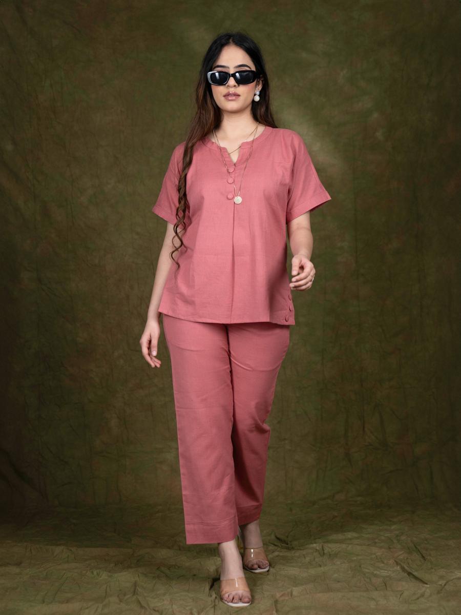 Product Descripiton :Step into contemporary fashion with this Pink Cotton Flex Cord Set, featuring stylish side button detailing for a modern touch. Made from soft and breathable cotton flex fabric, this ensemble ensures all-day comfort without compromising on style. Perfect for casual outings, workwear, or relaxed evenings, this cord set is a versatile addition to your wardrobe