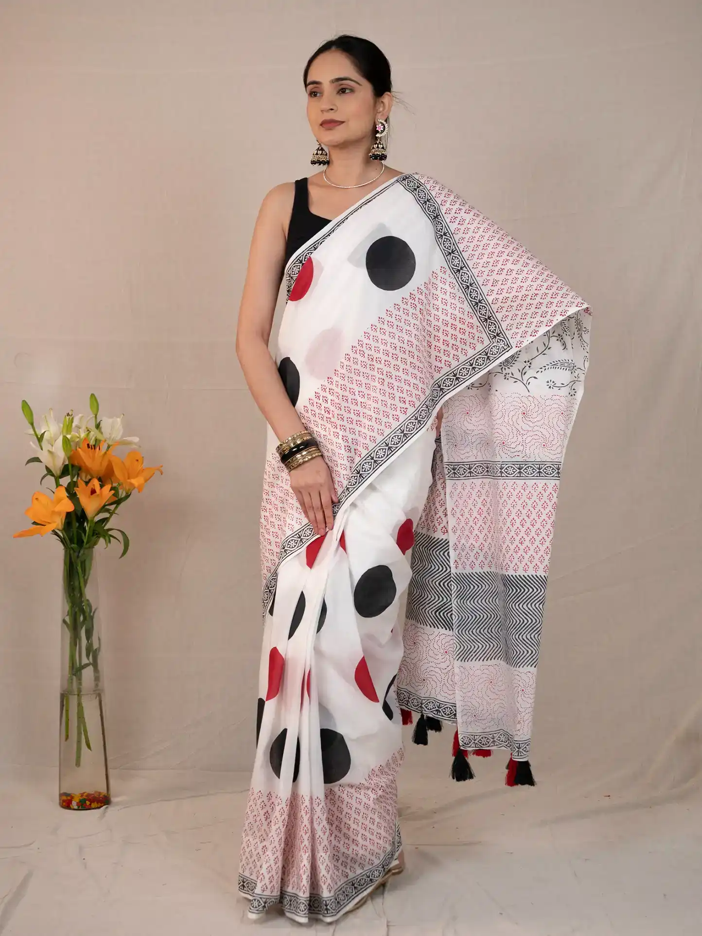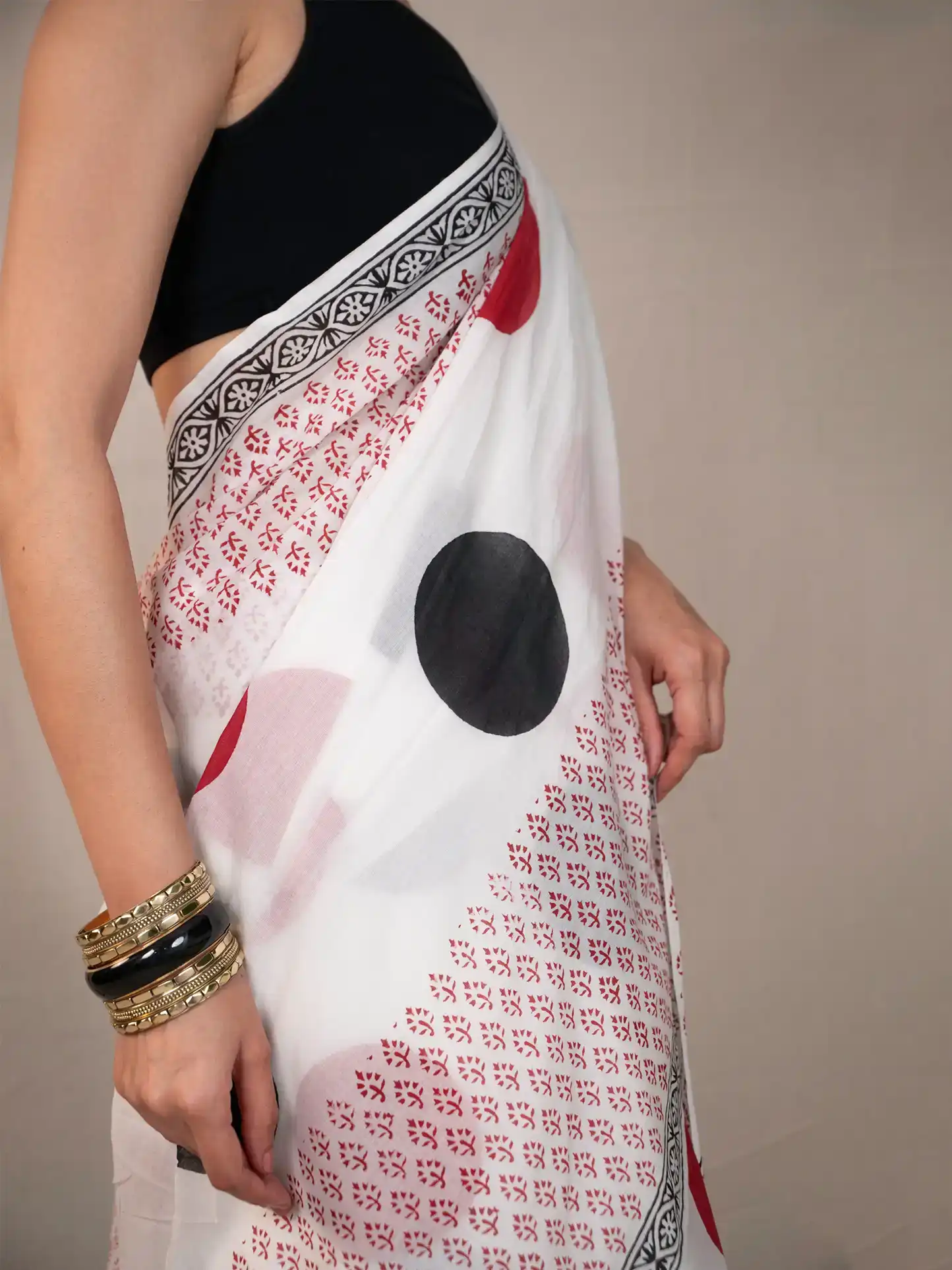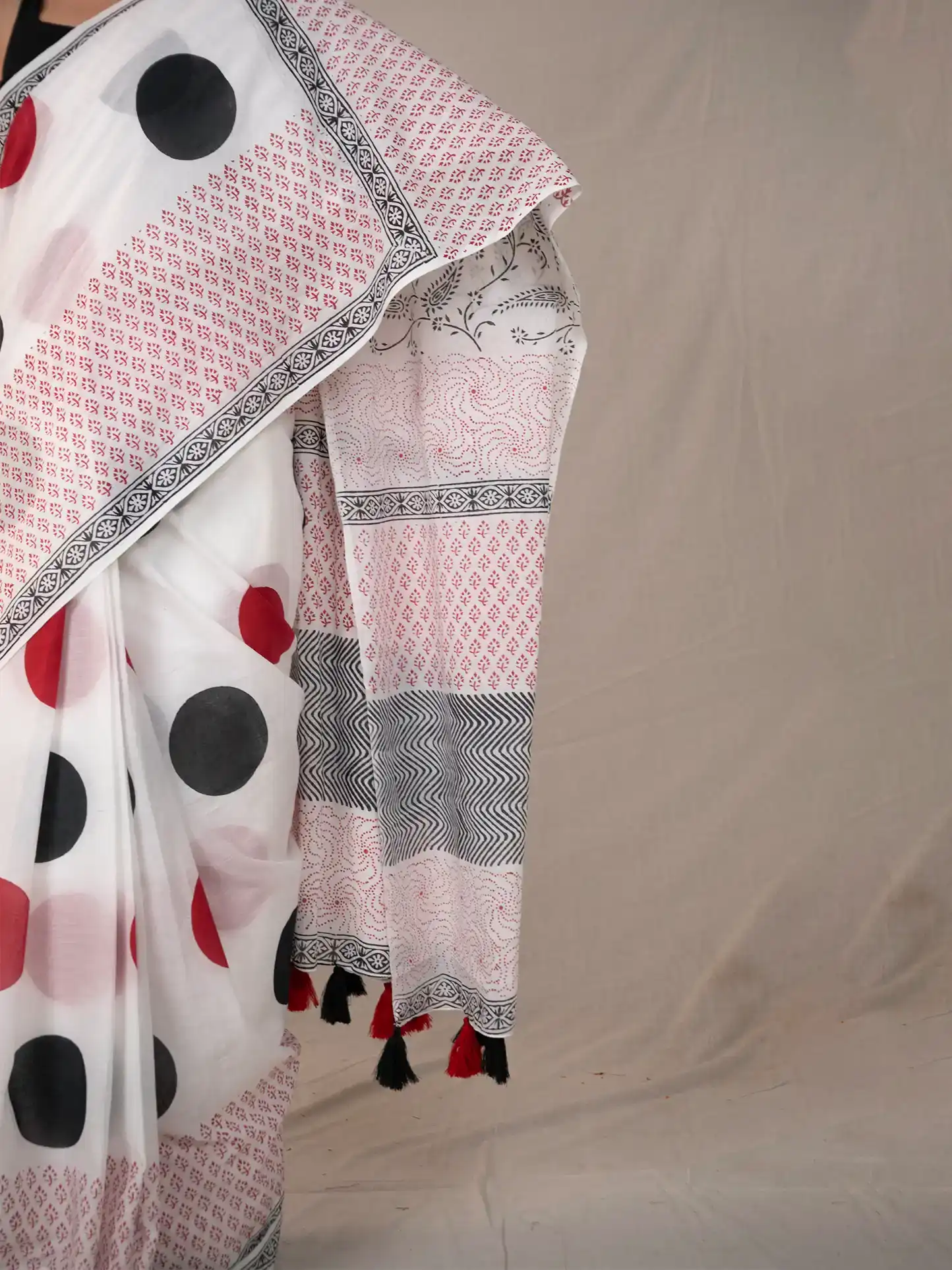 Product Descripiton :Playful yet poised, this Black and red polka dot Saree is hand block printed in soft 100% cotton, offering comfort with character. The classic polka dot motif is reimagined through handcraft - giving each dot its own personality and charm