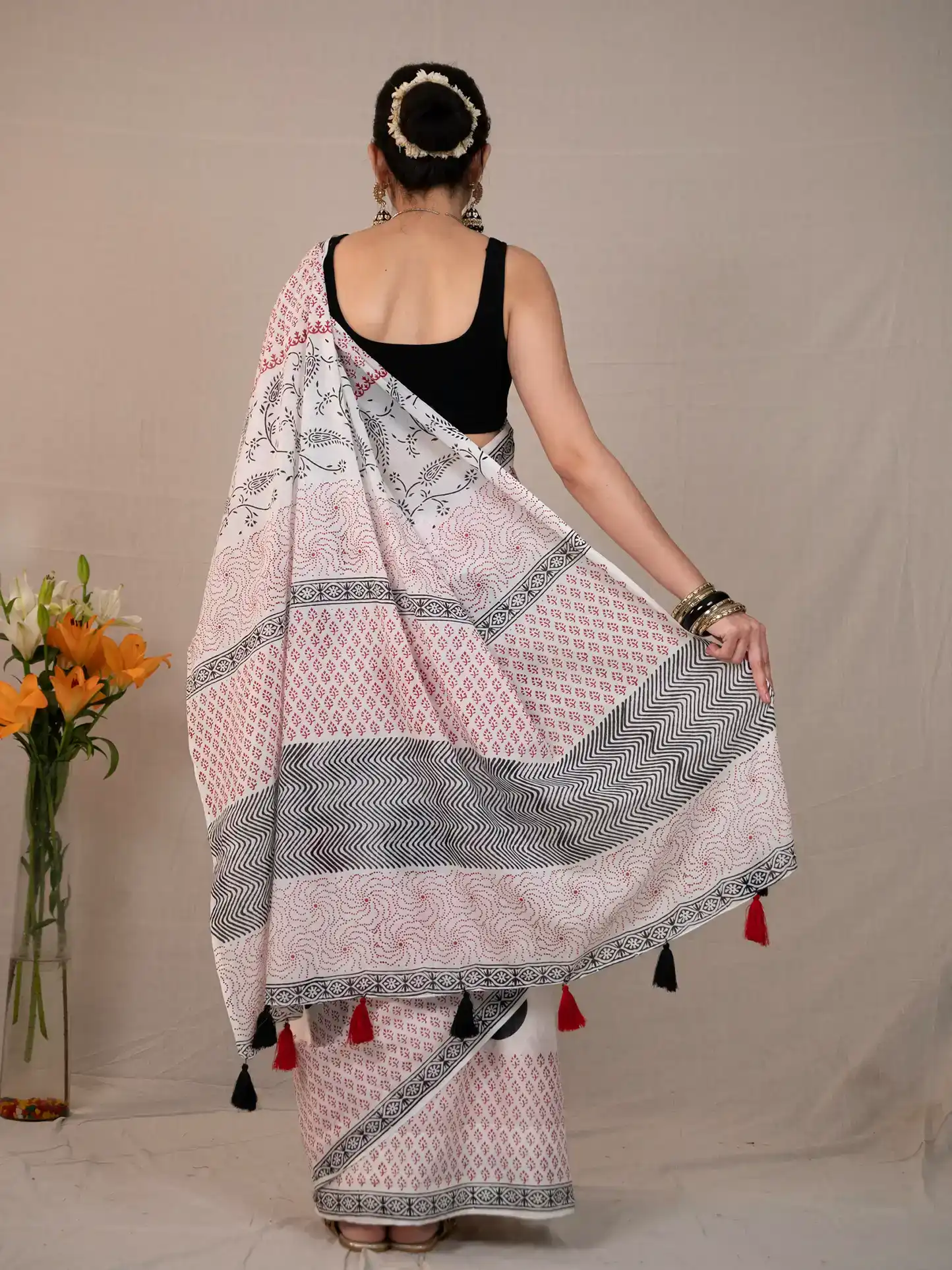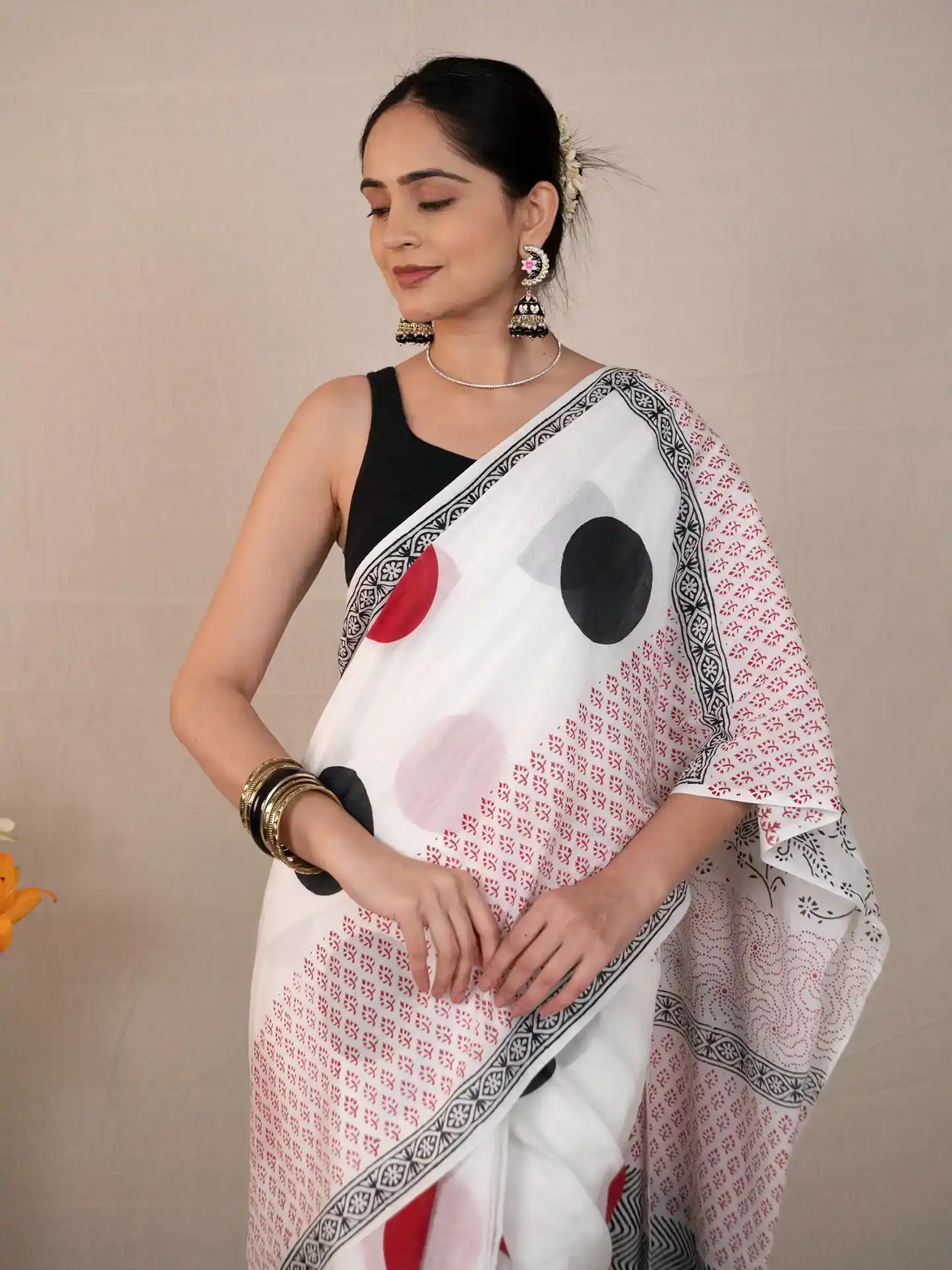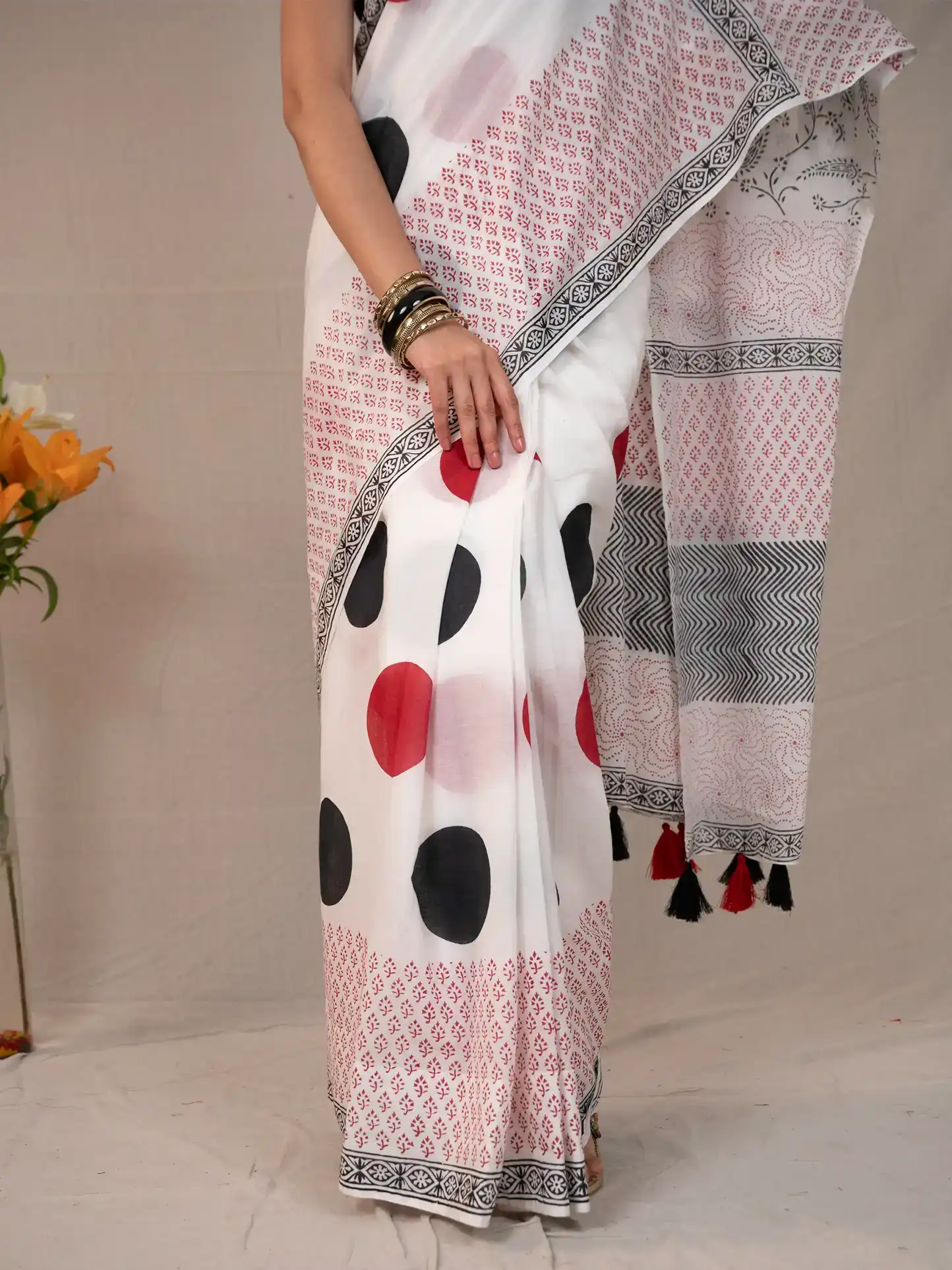 Product Descripiton :Playful yet poised, this Black and red polka dot Saree is hand block printed in soft 100% cotton, offering comfort with character. The classic polka dot motif is reimagined through handcraft - giving each dot its own personality and charm