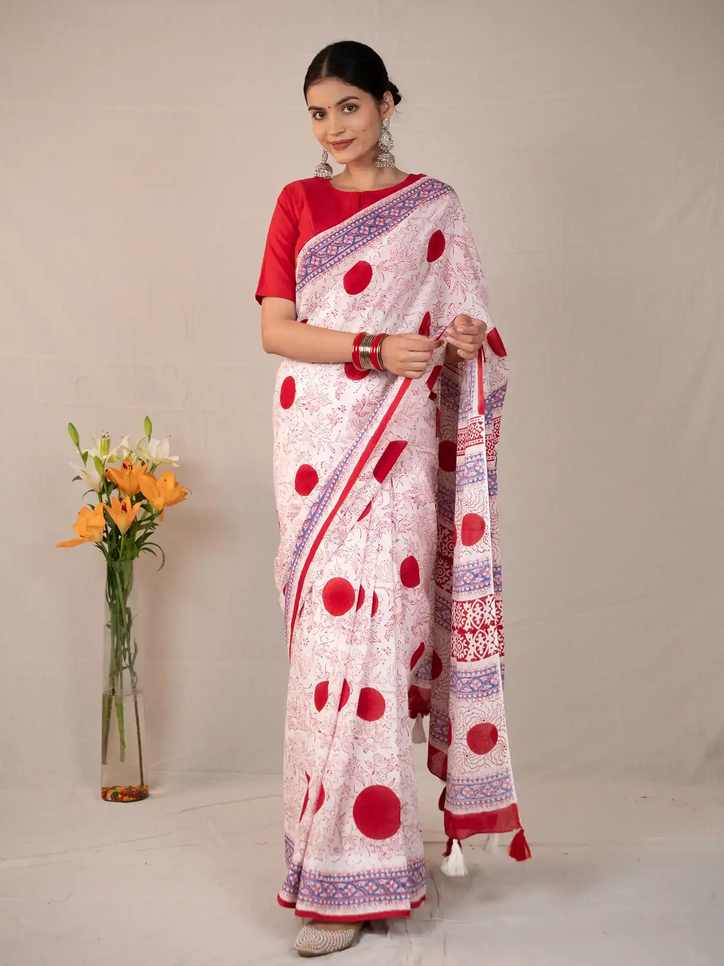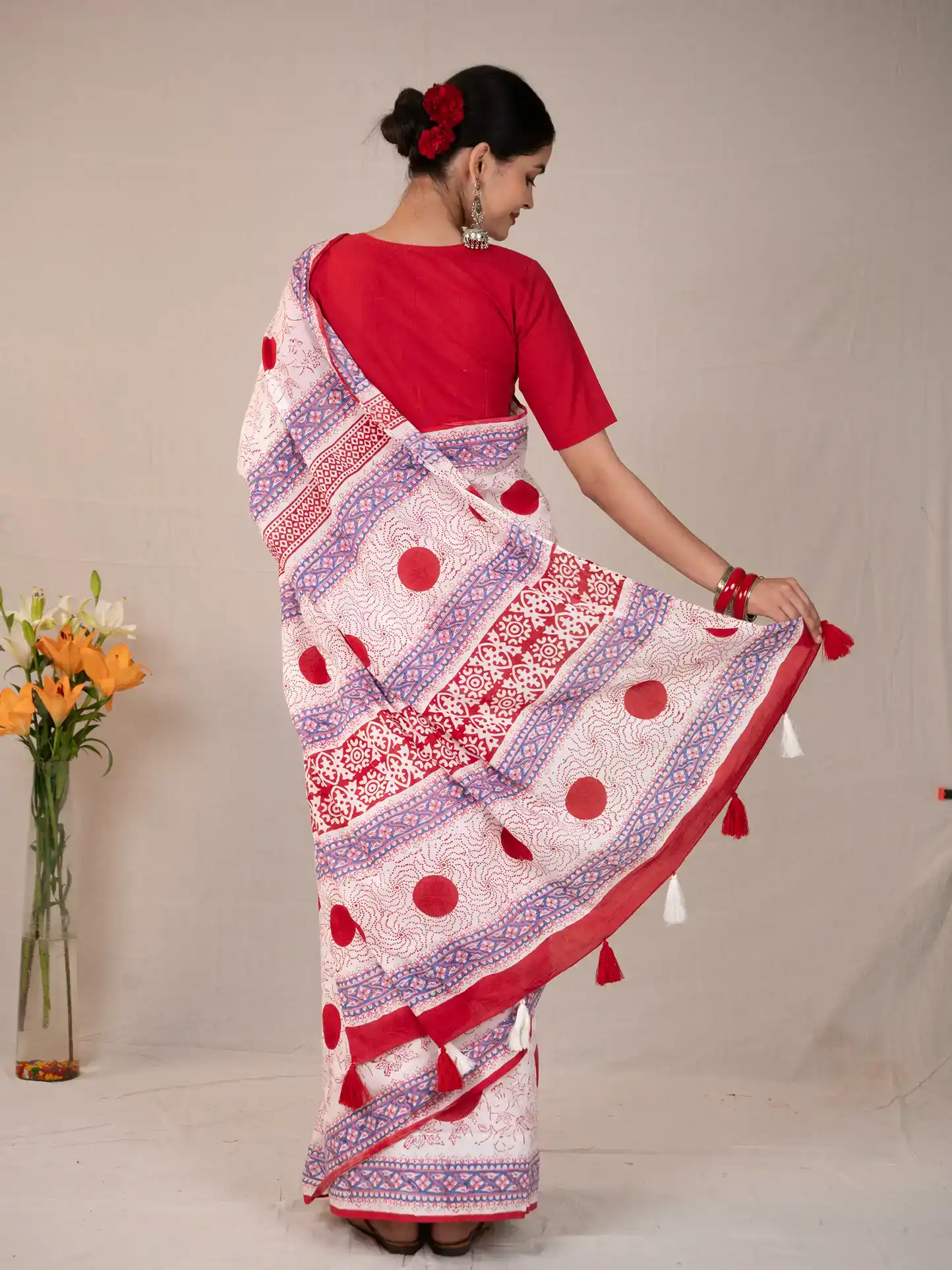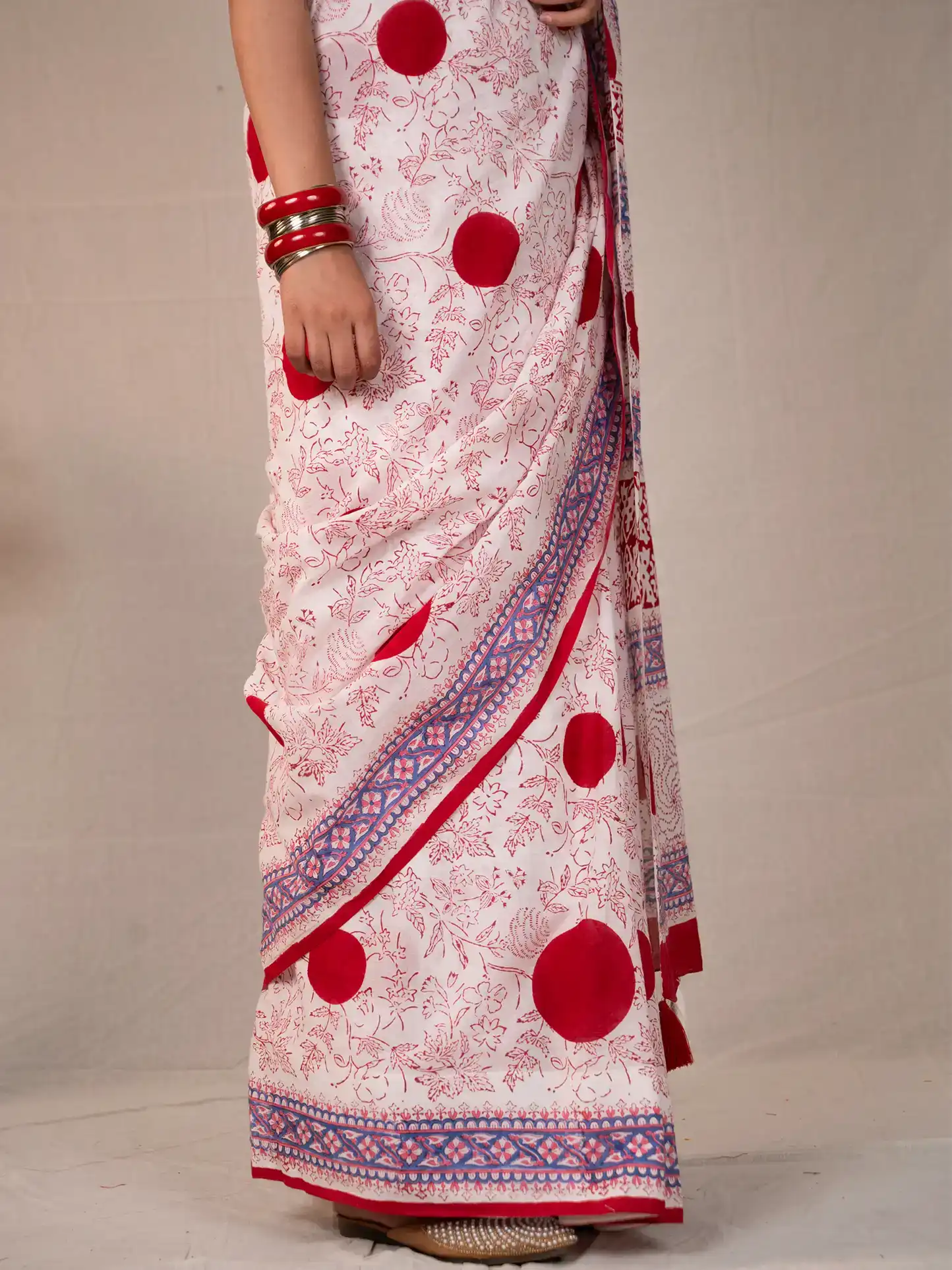 Product Descripiton :Playful yet poised, this Red Polka Dot Saree is hand block printed in soft 100% cotton, offering comfort with character. The classic polka dot motif is reimagined through handcraft - giving each dot its own personality and charm