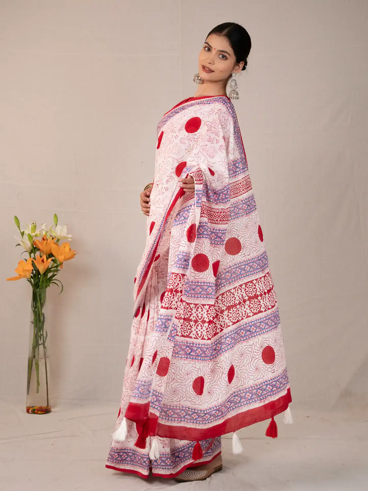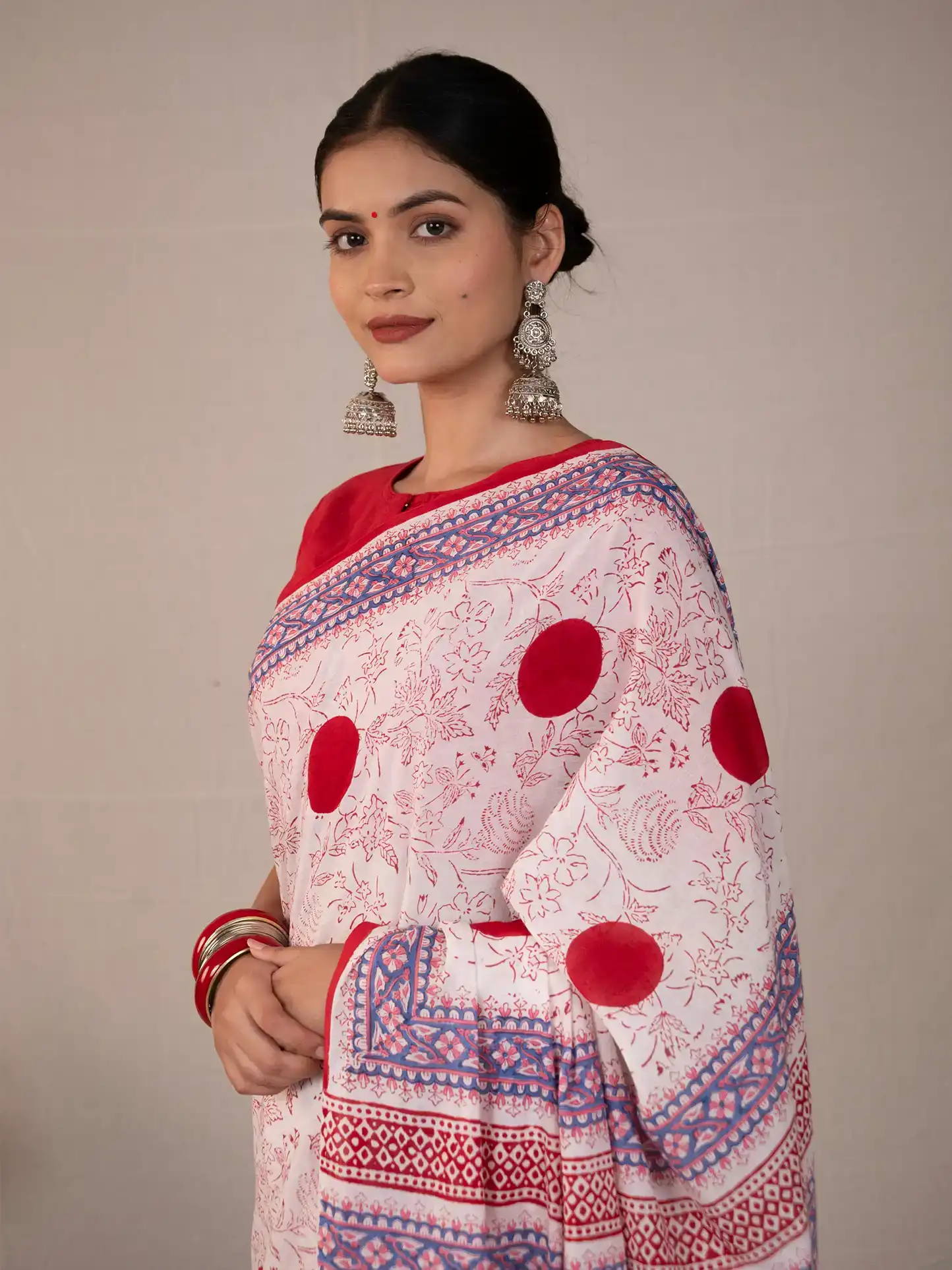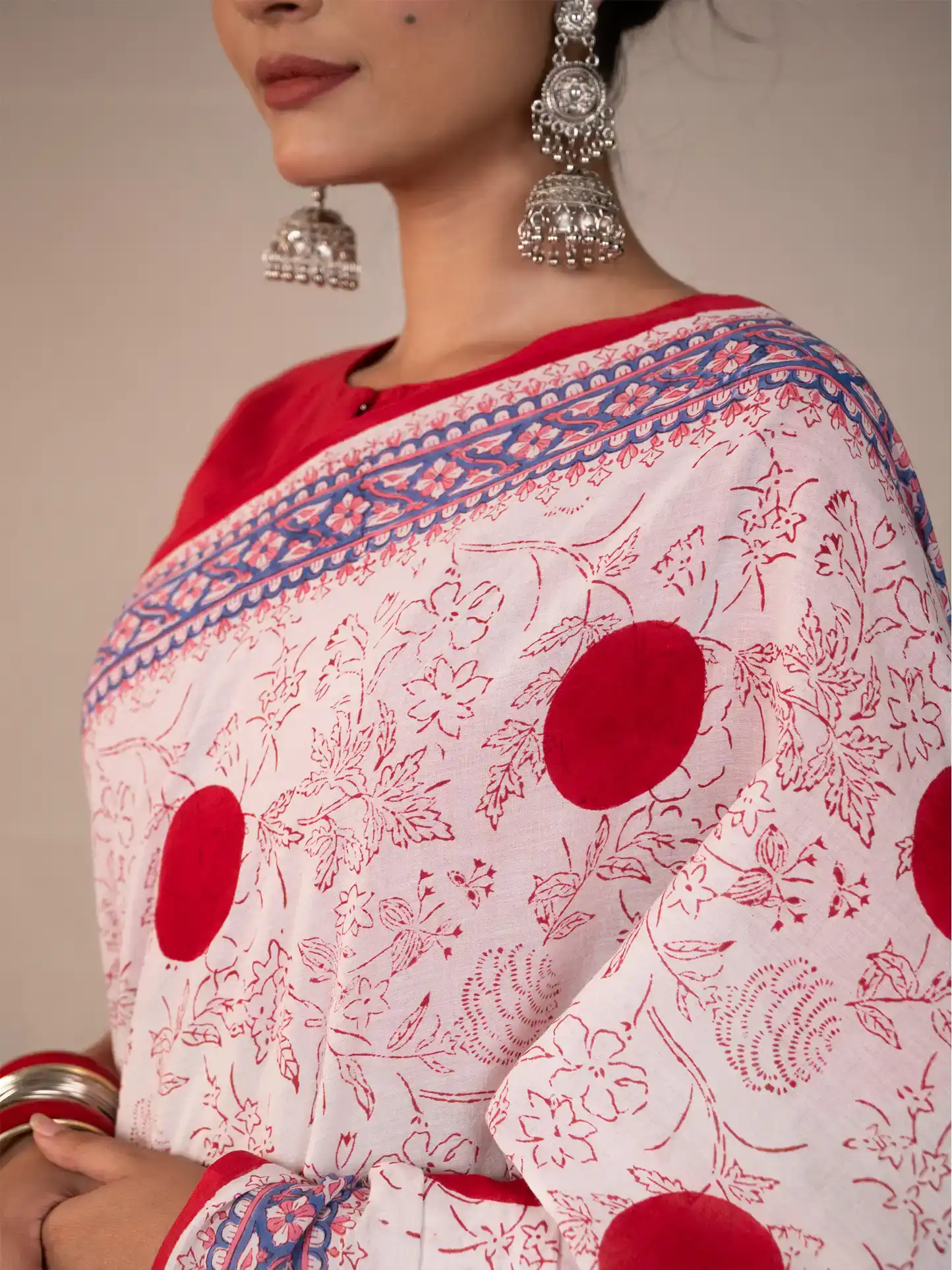 Product Descripiton :Playful yet poised, this Red Polka Dot Saree is hand block printed in soft 100% cotton, offering comfort with character. The classic polka dot motif is reimagined through handcraft - giving each dot its own personality and charm