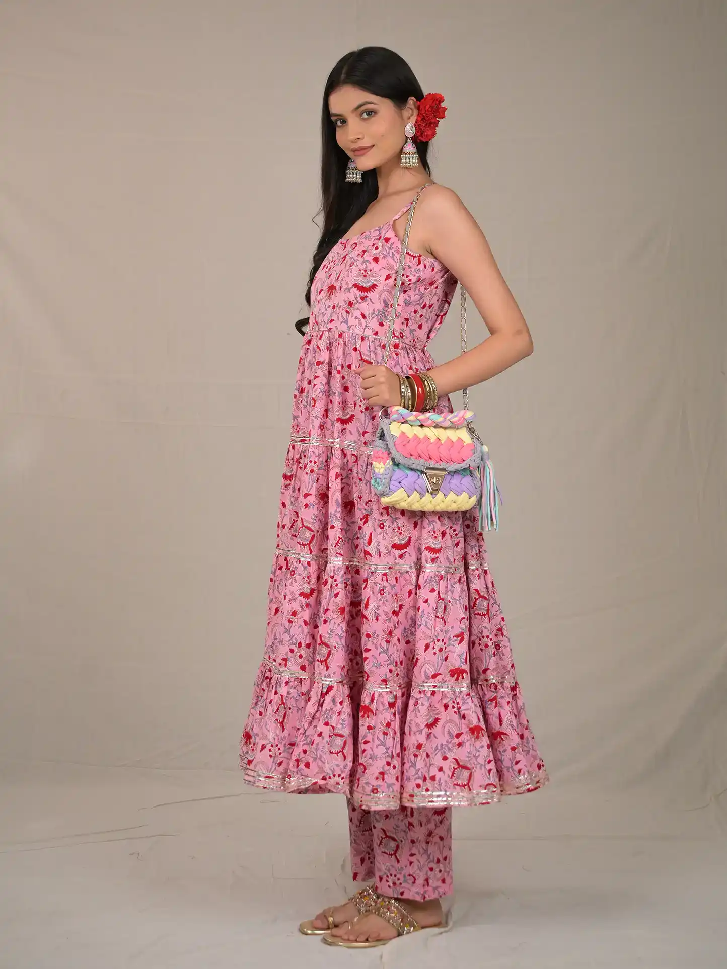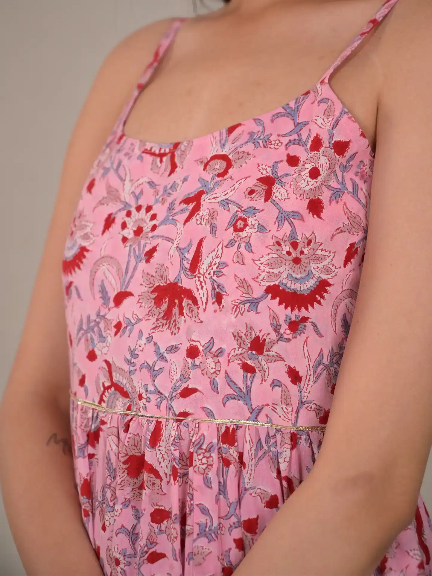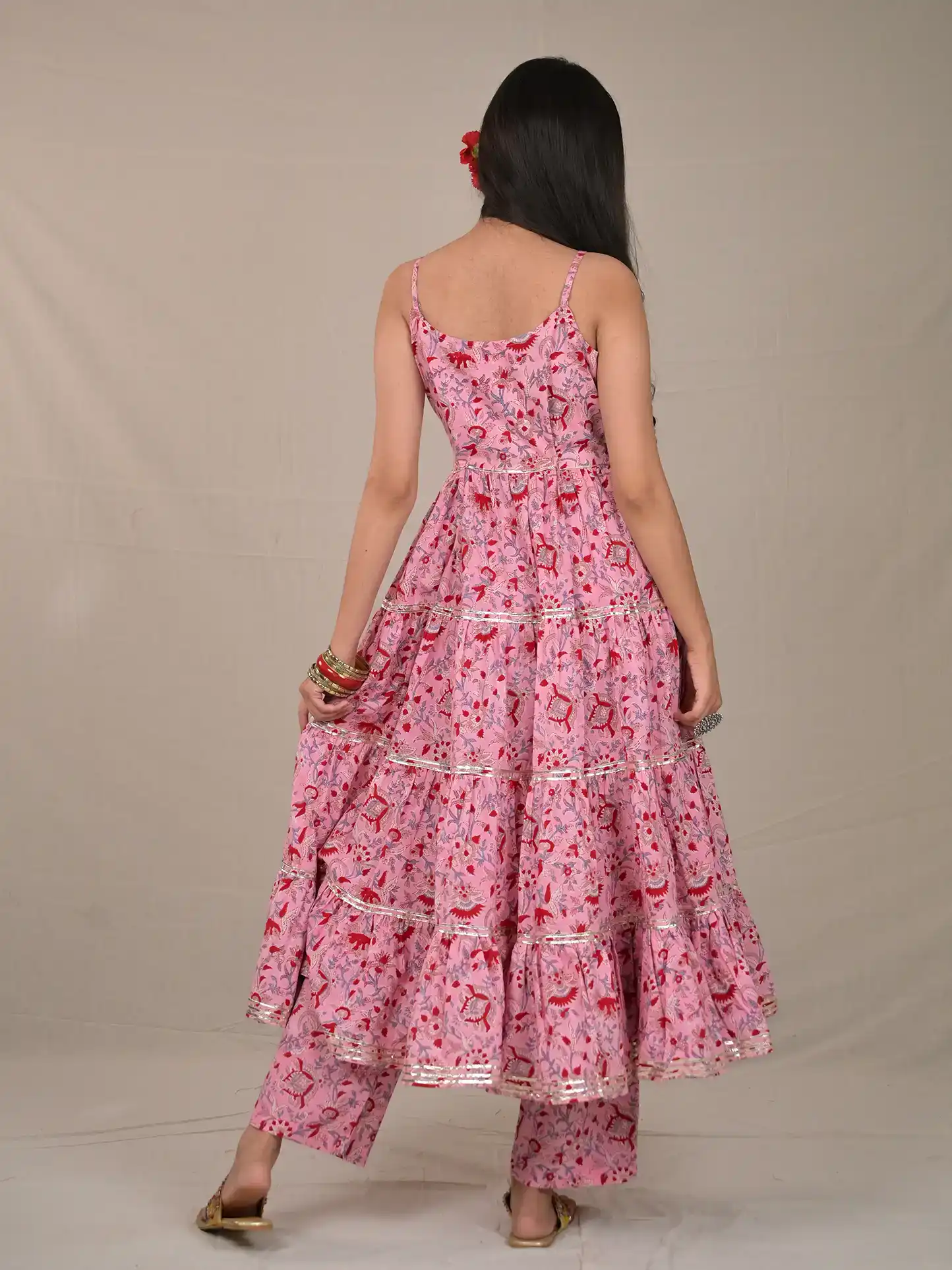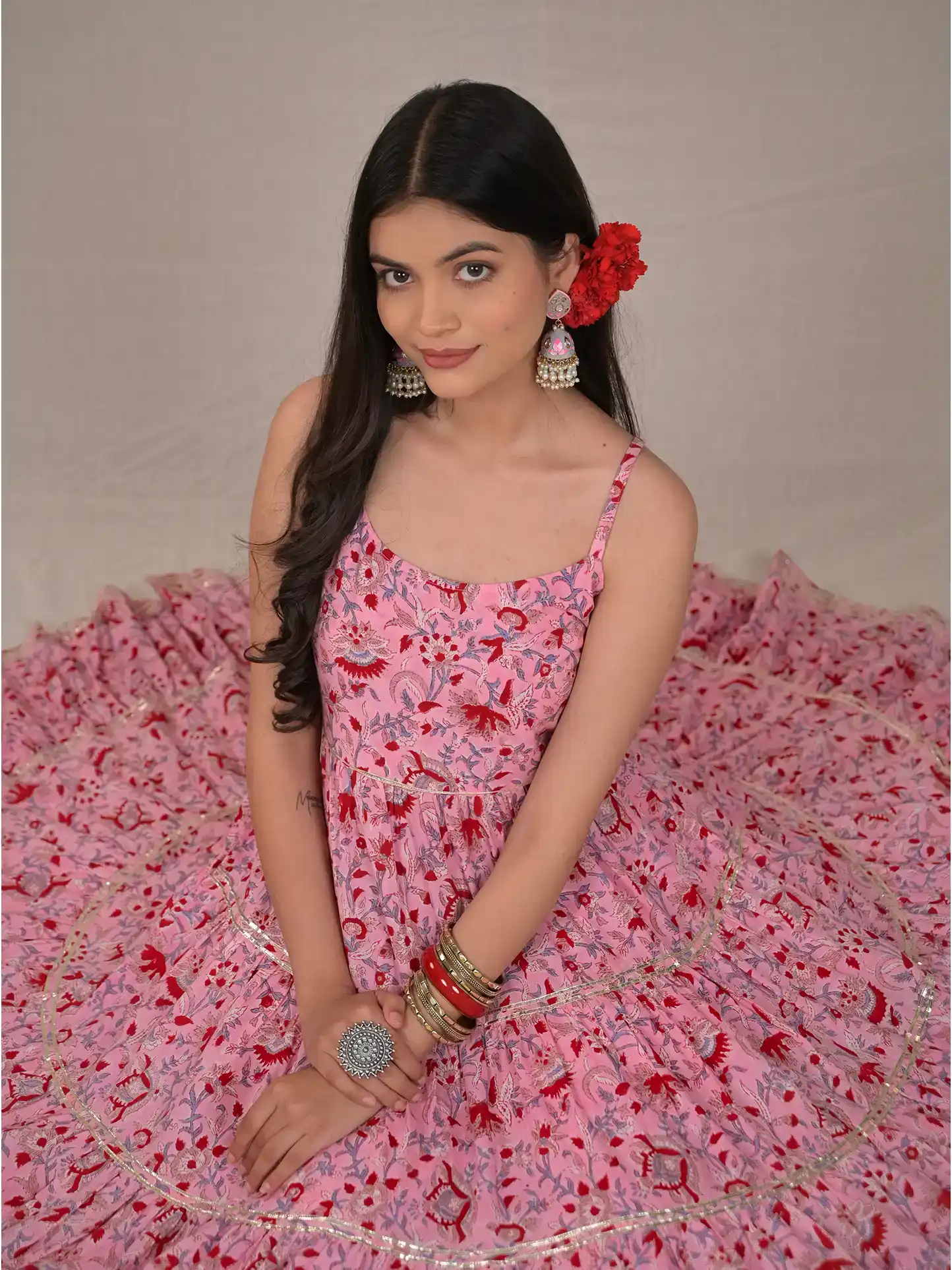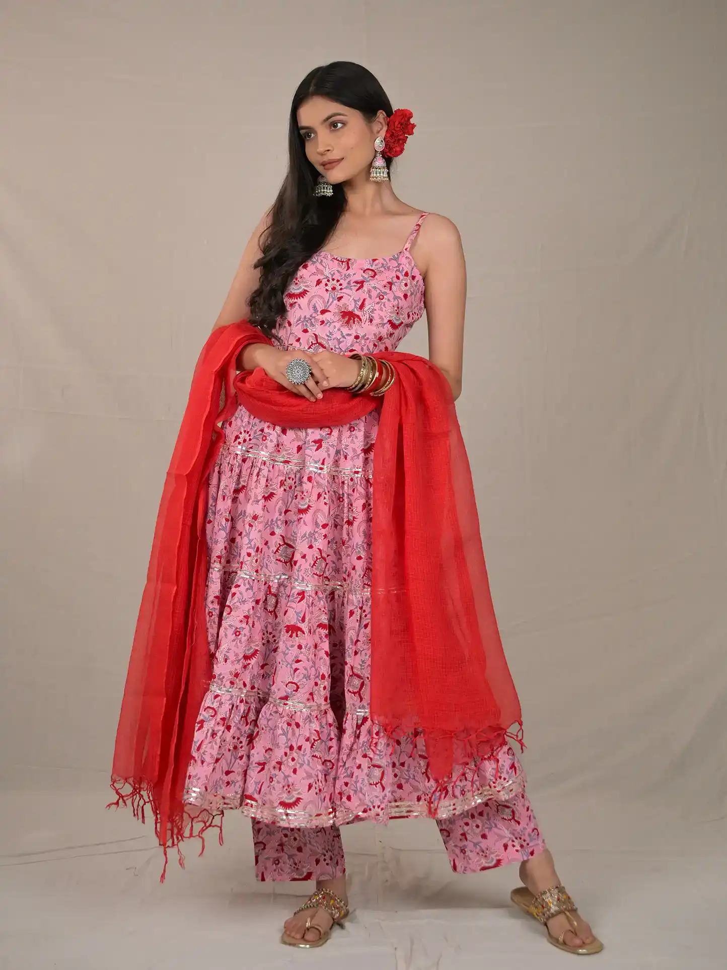 Product Descripiton :Made from 100% soft cotton, this sleeveless kurta set with kota doriya dupatta, features a flared silhouette and delicate hand block printed floral patterns, giving it a light, graceful charm