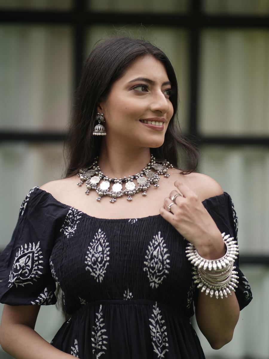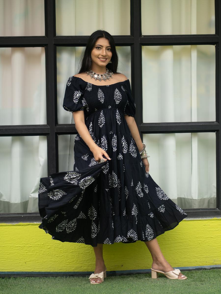 Product Descripiton :Make a statement with this Roohani Mughal Hand Block Printed Dress, blending heritage artistry with a chic off-shoulder design. Featuring intricate Mughal-inspired hand block prints, this dress is crafted from soft, breathable fabric for all-day comfort. The bold black hue and off-shoulder silhouette create a striking, modern aesthetic, making it perfect for festive events, evening gatherings, or casual outings