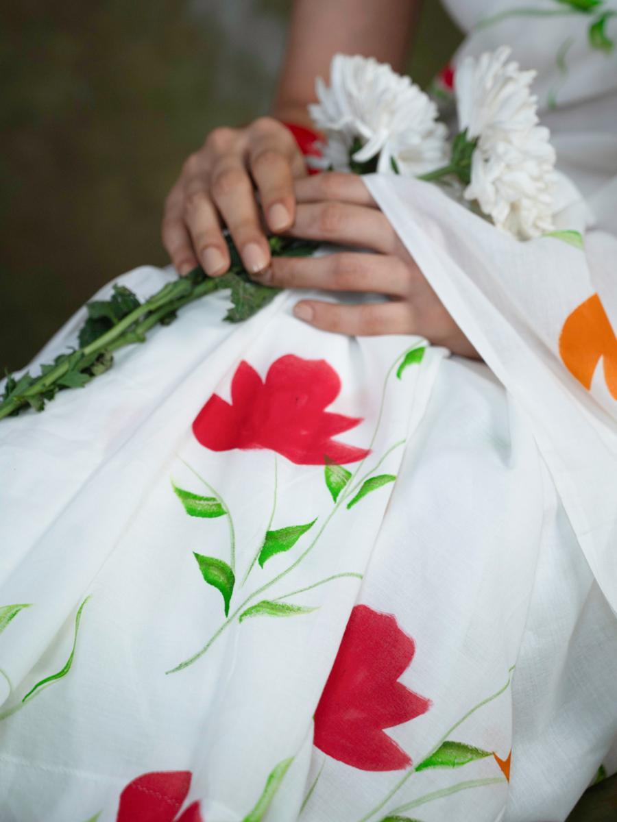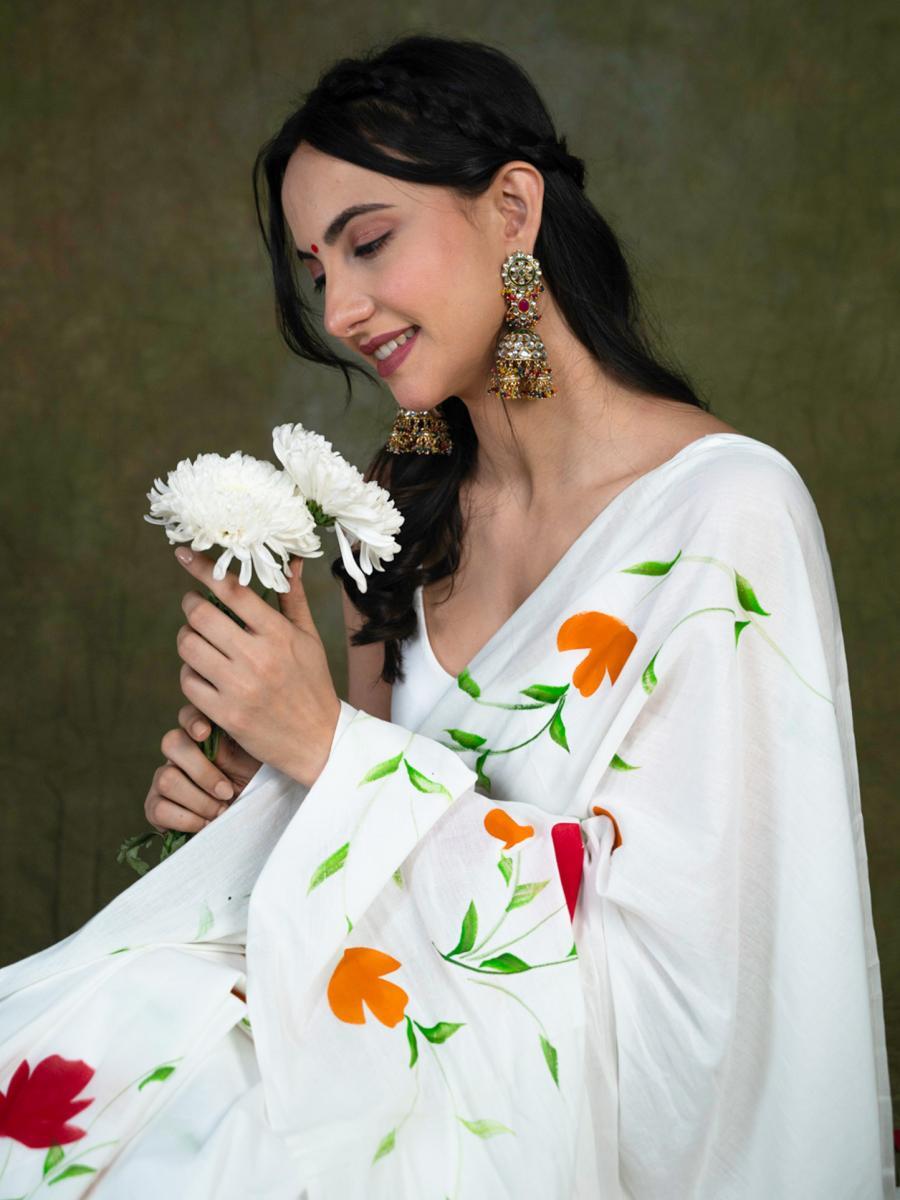 Product Descripiton :The Safed Handpainted Cotton Mulmul Saree with Brush-Painted Flowers is a perfect blend of elegance and artistry. Ideal for women who appreciate unique, handcrafted designs, this saree ensures you stand out with grace and individuality.