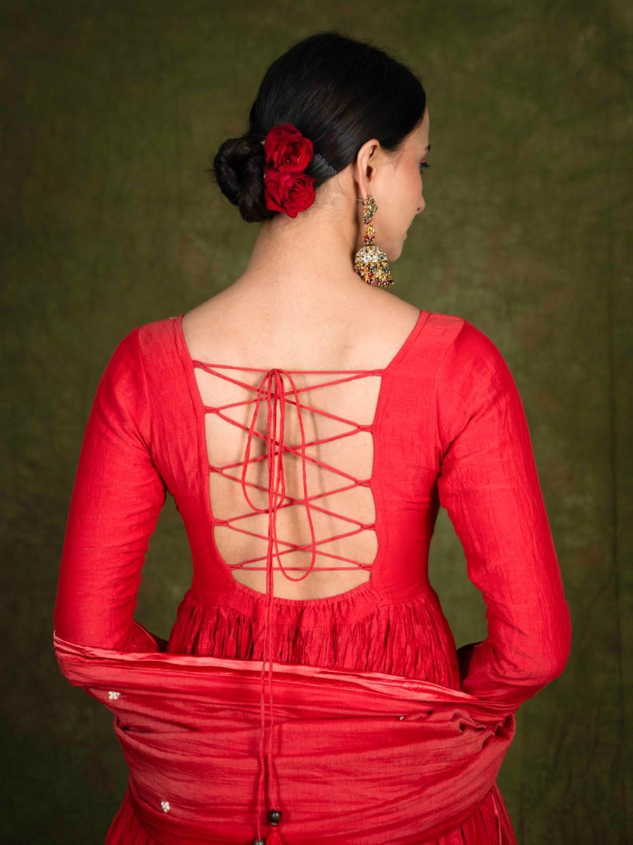 Product Descripiton :Unveil the epitome of luxury with this Soorkh Laal Silk Anarkali Churidar Kurta Set, a stunning blend of elegance and artistry. The flowing Anarkali kurta, crafted from luxurious silk, complements its vibrant red hue, while the highlight of this ensemble is the intricately hand-embroidered dupatta with delicate cut dana handwork.