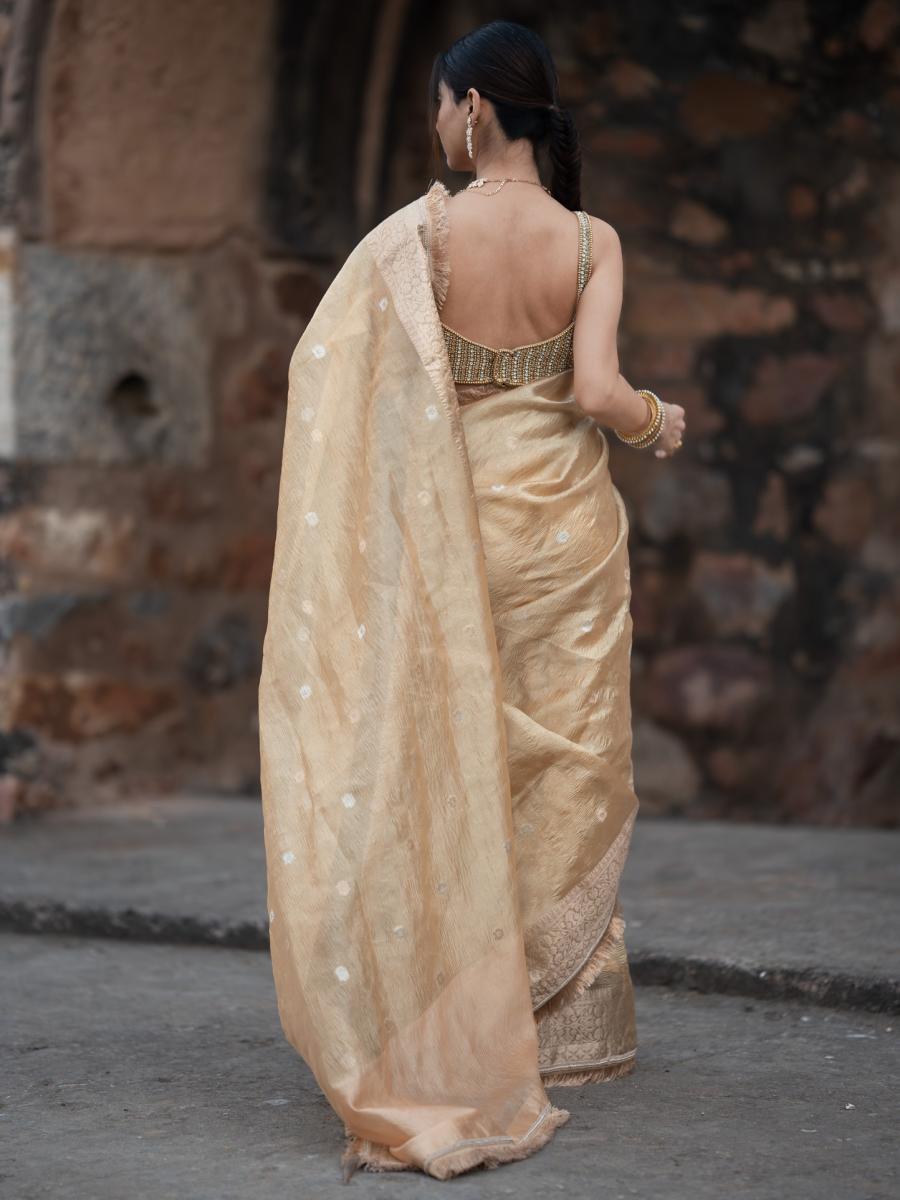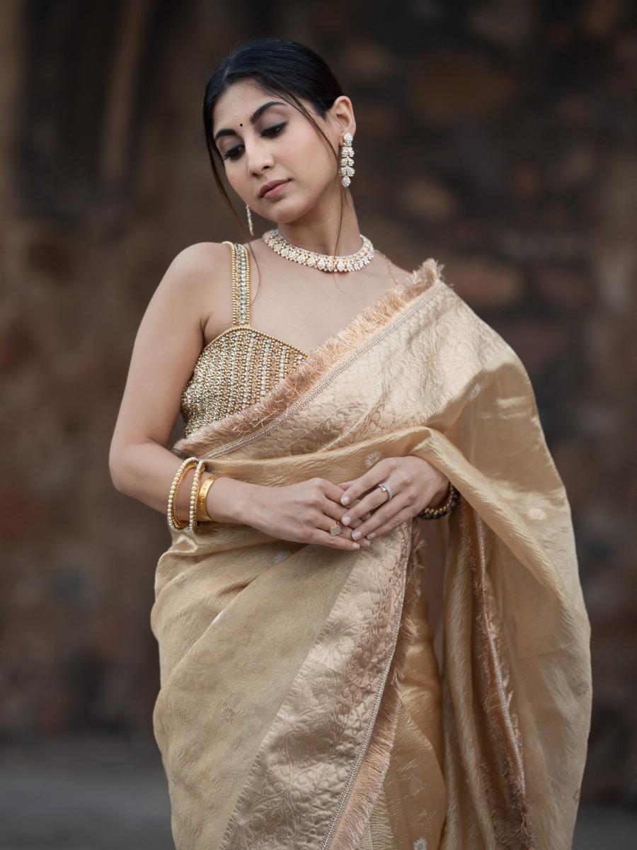 Product Descripiton :Unveil the beauty of understated luxury with this Sunehri Crushed Tissue Silk Saree. Exquisitely woven on traditional Banarasi looms, this saree features a delicate crushed texture that enhances its ethereal elegance. The gold hue combined with the subtle sheen of tissue silk creates a breathtakingly graceful ensemble, perfect for weddings, evening events, or festive celebrations