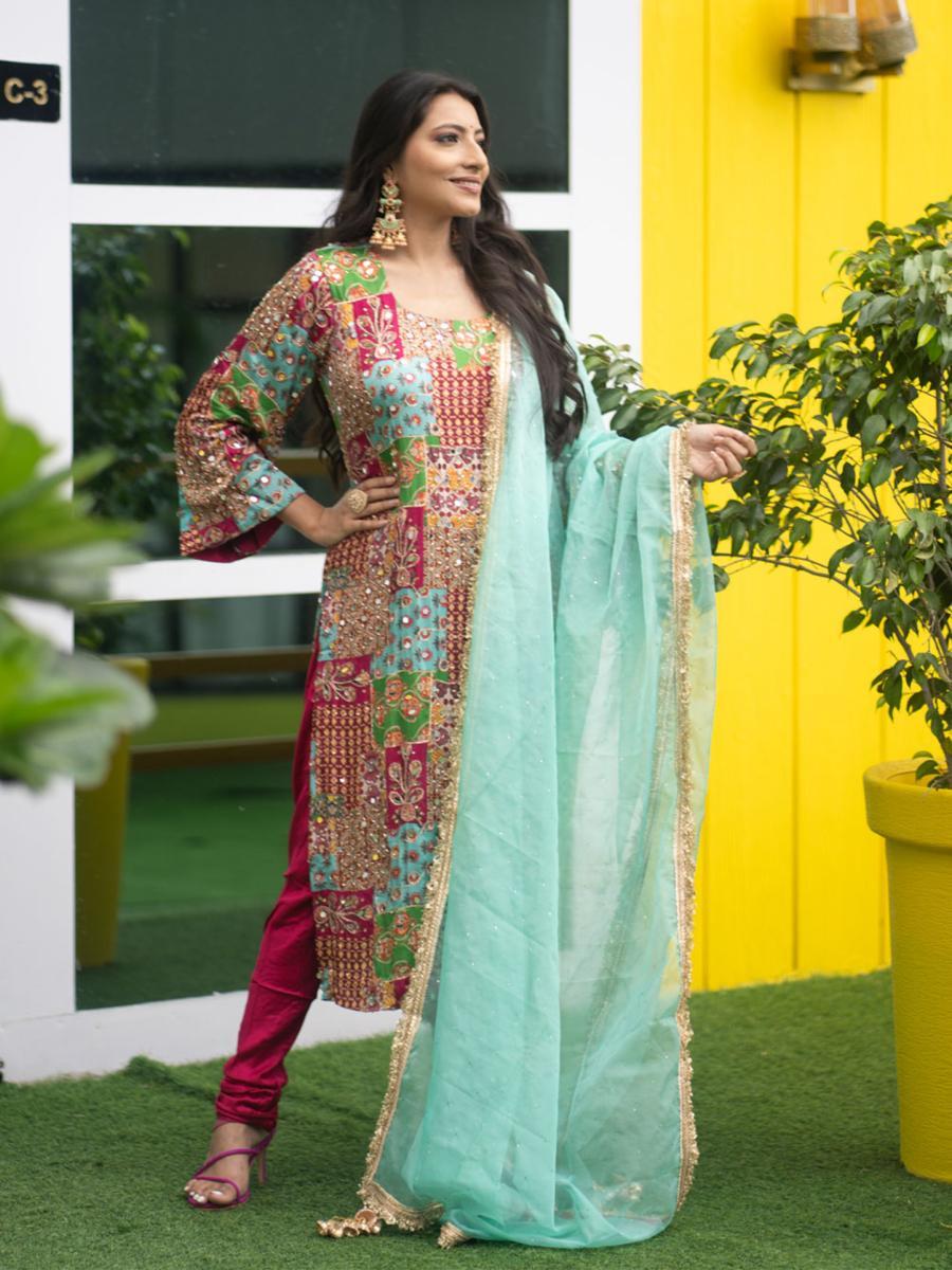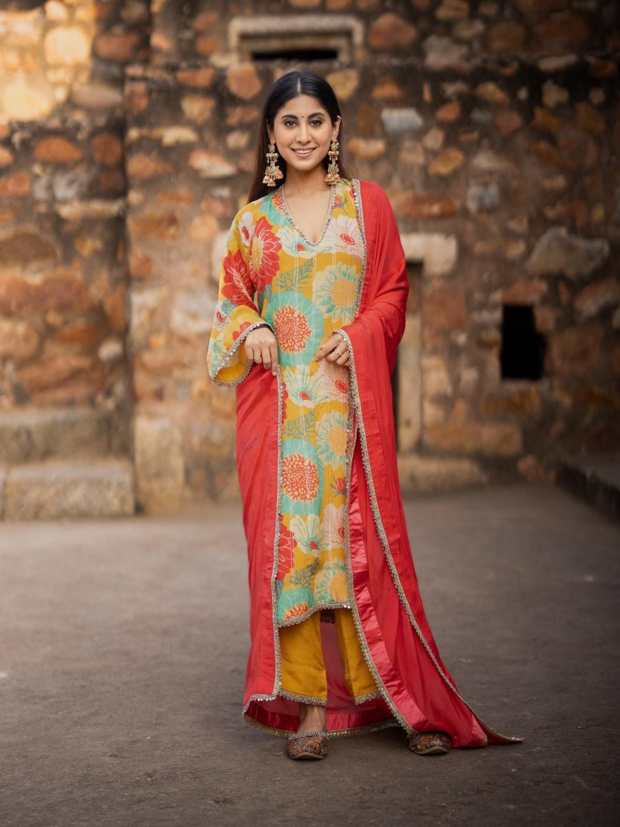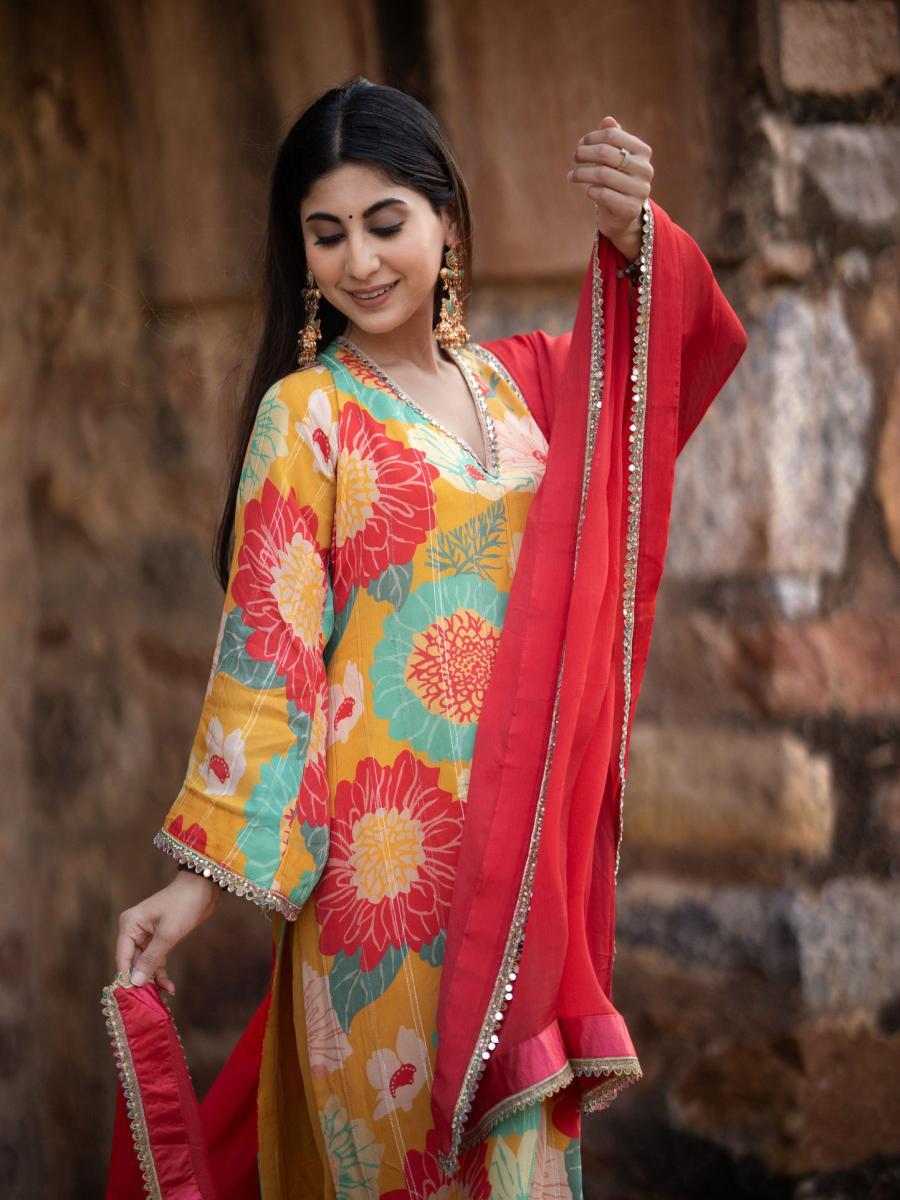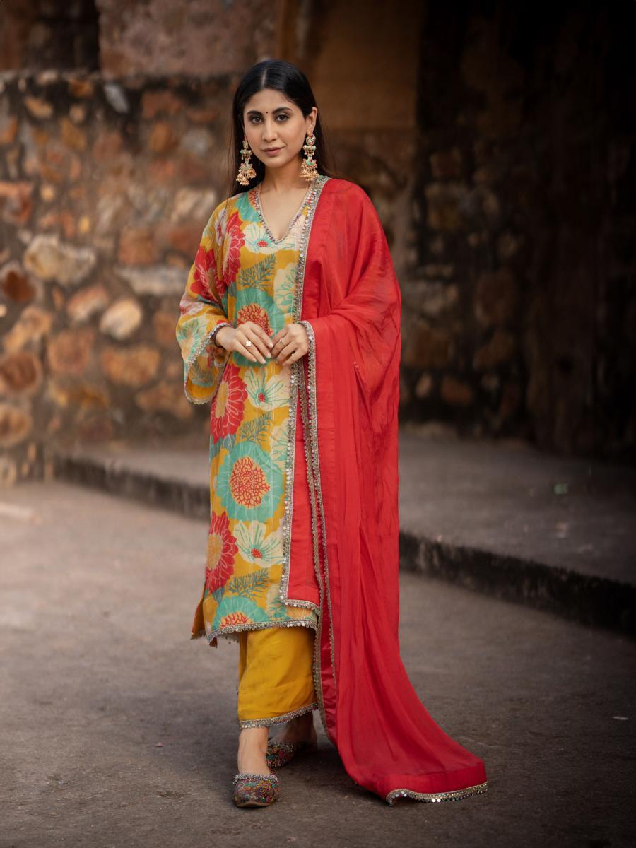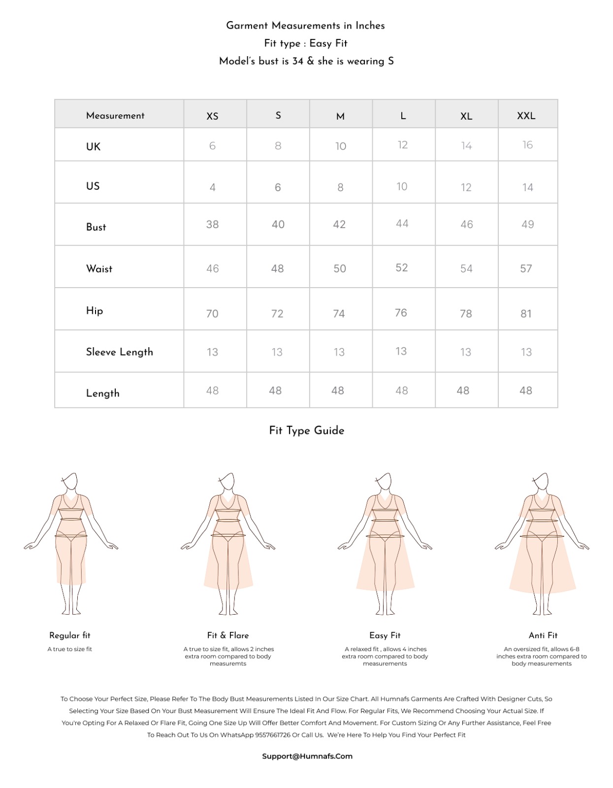 Size and Fit:Kurta Length 46 Inch Pant Length 36 Inch Dupatta 2.5 Mtr (Model is wearing size S, and this fit is relaxed fit)