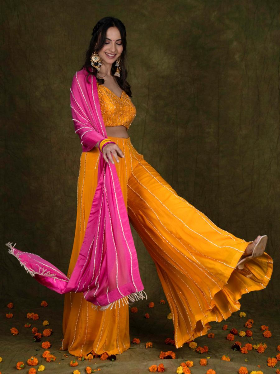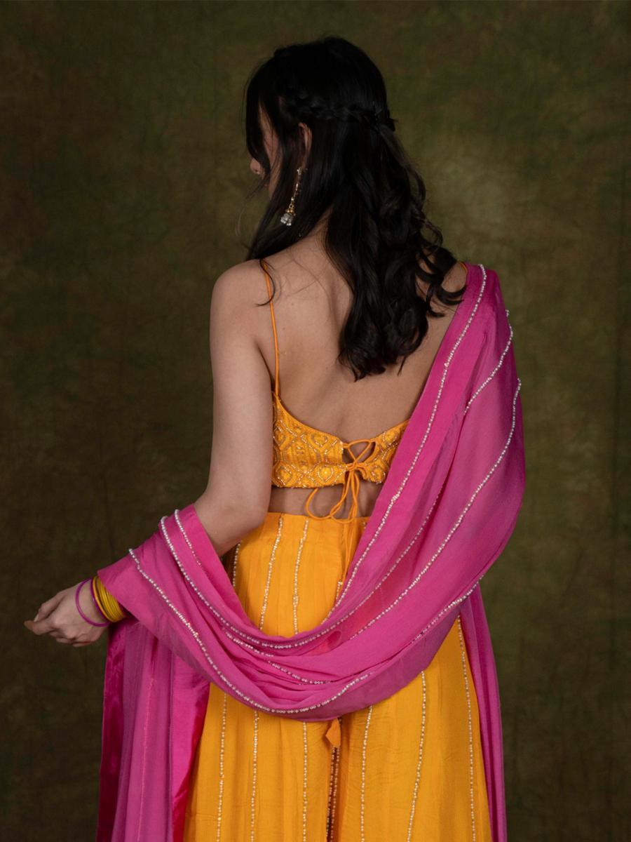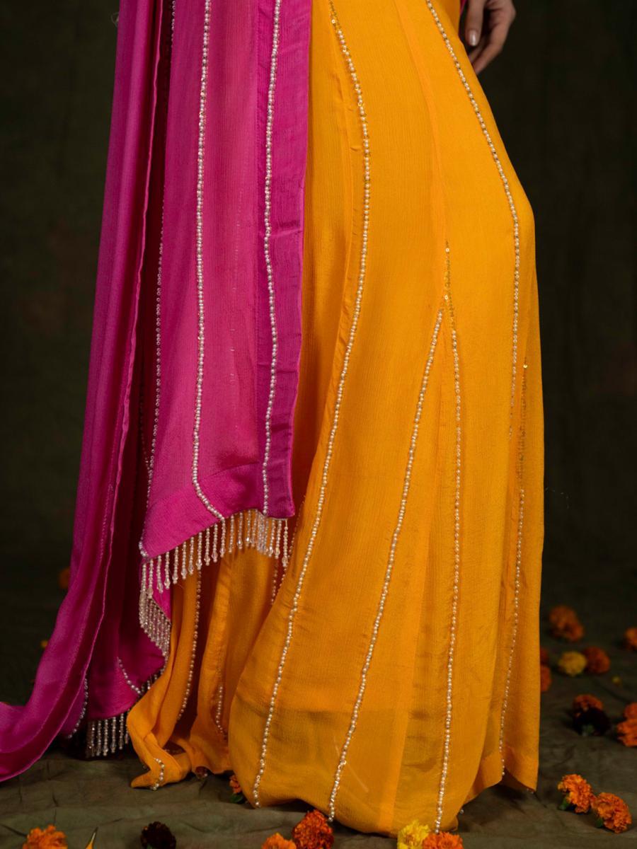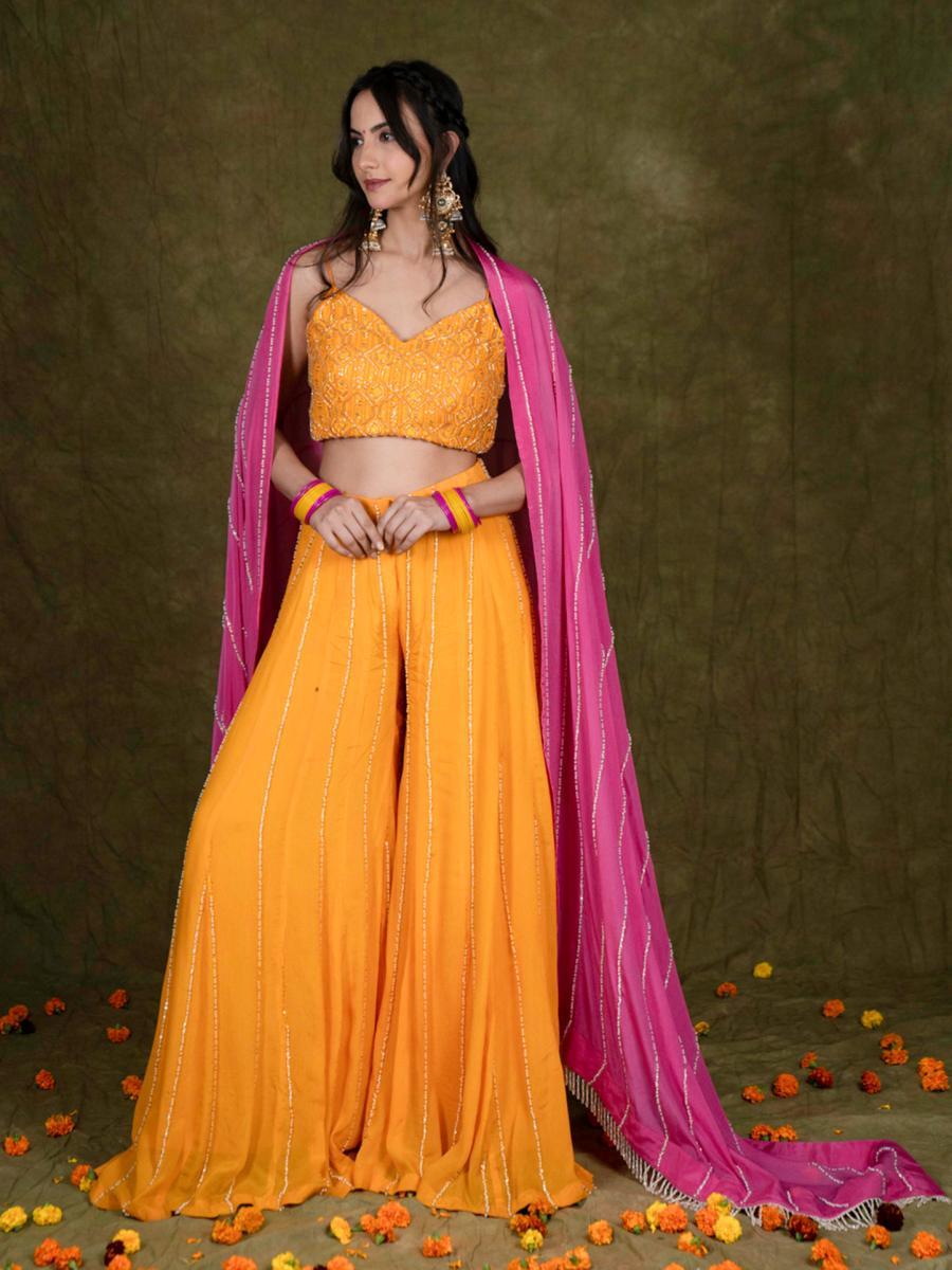 Product Descripiton :Elevate your festive wardrobe with this Yellow Crop Top and Sharara Set, paired with a beautiful pink pearl embroidery dupatta. Crafted from luxurious chiffon, the sharara features intricate pearl embroidery, adding a touch of sophistication to the ensemble. Perfect for weddings, festive celebrations, or grand occasions, this set is designed to make you stand out with its elegant charm and contemporary silhouette