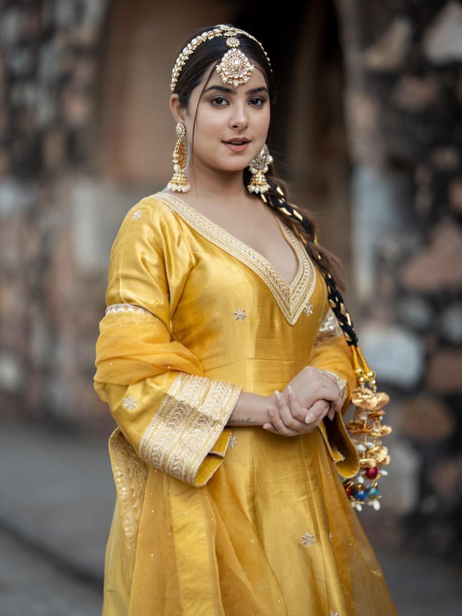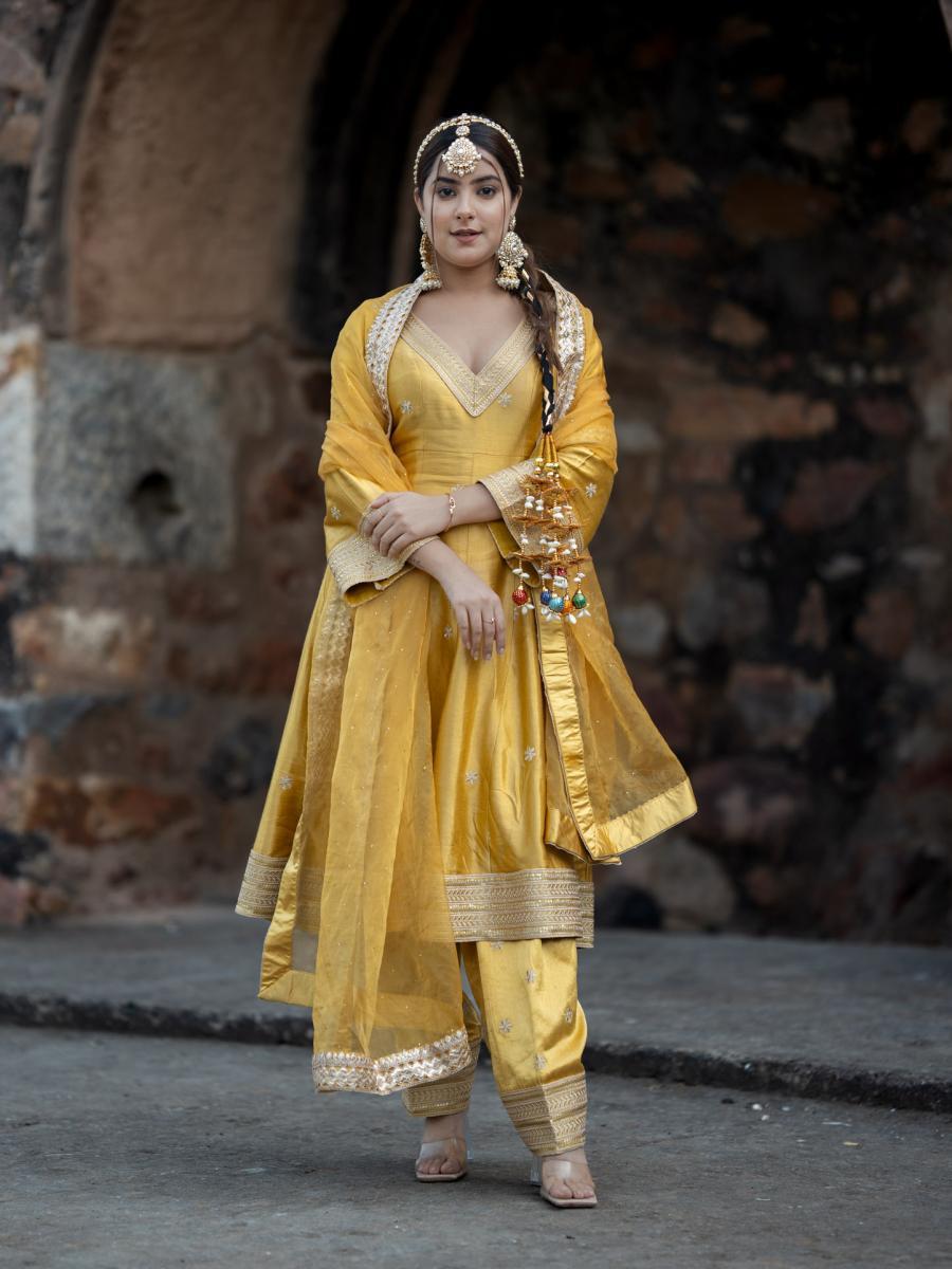 Product Descripiton :Step into timeless sophistication with this Yellow Gold Pure Gajji Silk Anarkali Kurta and Salwar Set, an ode to luxury and tradition. The rich, lustrous gajji silk fabric creates a flowing silhouette, while the vibrant yellow-gold hue adds a radiant charm. Paired with a delicate organza dupatta adorned with intricate gota patti lace, this ensemble is perfect for weddings, festive celebrations, and cultural gatherings, ensuring you stand out with grace and elegance